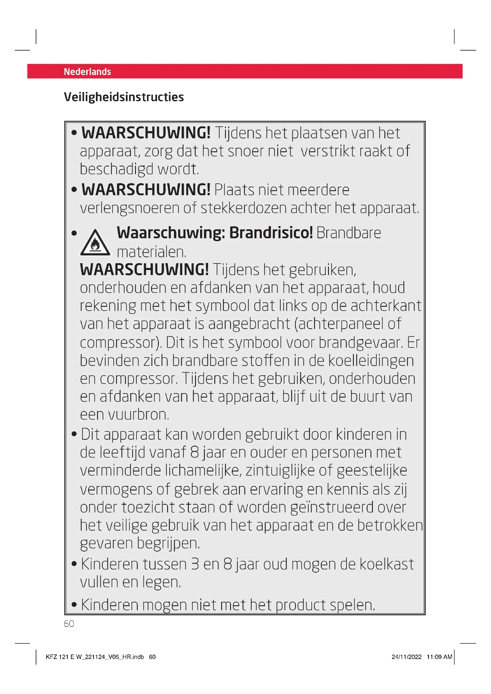 - Waarschuwing! Gebruik geen elektrische producten in de voedselopslagcompartimenten van de vrieskist, tenzij deze door de fabrikant zijn aangeraden. KFZ 121 E W_221124_V05_HR.indb 61KFZ 121 E W_221124_V05_HR.indb 61 24/11/2022 11:09 AM24/11/2022 11:09 AMNederlands