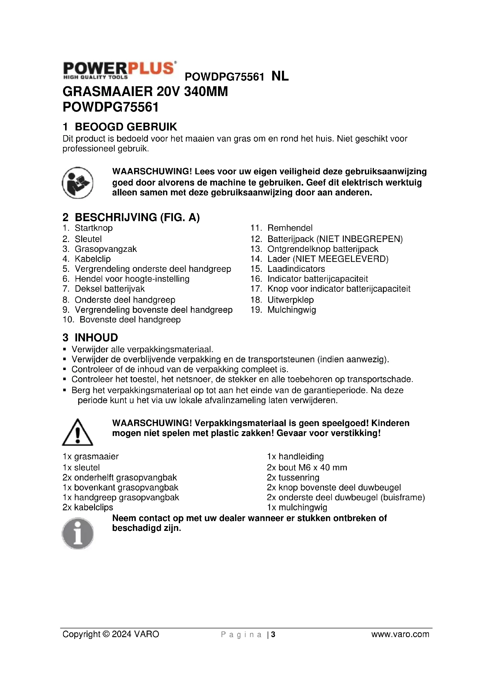 - Berg het verpakkingsmateriaal op tot aan het einde van de garantieperiode. Na deze periode kunt u het via uw lokale afvalinzameling laten verwijderen. WAARSCHUWING! Verpakkingsmateriaal is geen speelgoed! Kinderen mogen niet spelen met plastic zakken! Gevaar voor verstikking! 1x grasmaaier 1x sleutel 2x onderhelft grasopvangbak 1x bovenkant grasopvangbak 1x handgreep grasopvangbak 2x kabelclips 1x handleiding 2x bout M6 x 40 mm 2x tussenring 2x knop bovenste deel duwbeugel 2x onderste deel duwbeugel (buisframe) 1x mulchingwig Neem contact op met uw dealer wanneer er stukken ontbreken of beschadigd zijn.POWDPG75561 NL Copyright © 2024 VARO P a g i n a | 4 www.varo.com