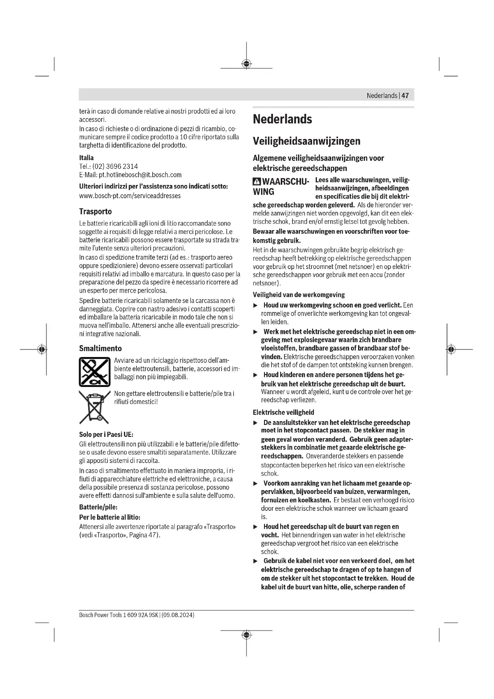– Rotazione destrorsa: per avvitare viti, spingere verso si- nistra fino all’arresto il commutatore del senso di rotazio- ne (5). – Rotazione sinistrorsa: per allentare o svitare viti, spinge- re verso destra fino all’arresto il commutatore del senso di rotazione (5). Regolazione della coppia di serraggio (vedere Fig. C) La coppia di serraggio dipende dal precarico della molla del- la frizione di stacco. La frizione di stacco si attiva sia in rota- zione destrorsa, sia in rotazione sinistrorsa, al raggiungimen- to della coppia di serraggio impostata. Per regolare la specifica coppia di serraggio, utilizzare esclu- sivamente l’apposito attrezzo (12) in dotazione. – Ruotare la copertura della frizione (1) fino a sovrapporre le due aperture. – Innestare l’attrezzo di regolazione (12) nella piccola con- vessità (rondella di regolazione (13)) della frizione e ruo- tare l’attrezzo di regolazione (12). Ruotando in senso orario, si otterrà una coppia di serraggio maggiore; ruotando in senso antiorario, la coppia di serrag- gio sarà minore. – Prelevare l’attrezzo di regolazione (12). Ruotare la coper- tura della frizione (1) fino a chiudere l’apertura, in modo da proteggere la frizione dalle contaminazioni. Avvertenza: La regolazione necessaria varia in base al tipo di collegamento a vite e andrà preferibilmente determinata con una prova pratica. Verificare il collegamento a vite di prova utilizzando una chiave torsiometrica. u Registrare il valore di coppia esclusivamente nell’am- bito della potenza indicata, perché altrimenti la frizio- ne a stacco automatico non può più inserirsi. u Verificare con regolarità la coppia di serraggio del col- legamento a vite e, all’occorrenza, regolare nuova- mente la frizione a stacco automatico. Accensione/spegnimento Gli avvitatori sono dotati di una frizione a stacco automatico proporzionale alla coppia di serraggio, regolabile nel campo indicato. Ta- le frizione interviene al raggiungimento della coppia di serraggio impostata. – Per accendere l’elettroutensile, spingere l’interruttore di avvio/arresto(8) sino a fine corsa. – L’elettroutensile si arresterà automaticamente al rag- giungimento della coppia di serraggio impostata. u Rilasciando in anticipo l’interruttore di avvio/arresto (8), la coppia di serraggio preimpostata non verrà rag- giunta. u Verificare con regolarità la coppia di serraggio del col- legamento a vite e, all’occorrenza, regolare nuova- mente la frizione a stacco automatico. Protezione contro il sovraccarico in funzione della temperatura In caso di sovraccarico, l’elettroutensile si spegne, fino a quando non sia rientrato nel campo di temperatura ottimale. Rilasciare l’interruttore di avvio/arresto (8) e riaccendere l’elettroutensile per proseguire il lavoro. Ad un numero di giri inferiore al 50%, l’elettroutensile non funzionerà con il rendimento ottimale. Pertanto, in alcuni ca- si, la protezione contro il sovraccarico in funzione della tem- peratura si attiverà in anticipo. In caso di problemi con tali impostazioni, configurare un numero di giri all’uscita supe- riore al 50%, oppure ridurre la coppia di serraggio massima utilizzata. Indicazioni operative u Applicare l’elettroutensile sul dado/sulla vite esclusi- vamente quando è spento. Gli utensili accessori in rota- zione possono scivolare. Indicatore avvitamenti (LED verde/rosso) Al raggiungimento della coppia preimpostata, la frizione a stacco automatico si attiverà. L’indicatore a LED (3) si ac- cenderà con luce verde. Se la coppia di serraggio preimpostata non è stata raggiunta, l’indicatore a LED (3) si accenderà con luce rossa e verrà emesso un segnale acustico. L’avvitamento dovrà essere eseguito nuovamente. Protezione dalle ripetizioni Se durante un avvitamento la frizione a stacco automatico è stata attivata, il motore si spegne. Il riavvio sarà possibile soltanto dopo 0,7 secondi di pausa. In tale modo si eviteran- no serraggi accidentali di avvitamenti già saldi. Manutenzione ed assistenza Manutenzione e pulizia u Prima di qualsiasi intervento sull’elettroutensile (ad es. per manutenzione, sostituzione dell’accessorio ecc.), prelevare la batteria. Qualora l’interruttore di av- vio/arresto venga premuto inavvertitamente, vi è rischio di lesioni. u Per poter garantire buone e sicure operazioni di lavo- ro, tenere sempre puliti l’elettroutensile e le fessure di ventilazione. u Dopo massimo 100000 avvitamenti, controllare che l’elettroutensile non presenti danni o usura nella sua interezza e verificare tutte le funzioni. Successiva- mente, regolare nuovamente la coppia della frizione. Servizio di assistenza e consulenza tecnica Il servizio di assistenza risponde alle Vostre domande relati- ve alla riparazione ed alla manutenzione del Vostro prodotto nonché concernenti le parti di ricambio. Disegni esplosi ed informazioni relative alle parti di ricambio sono consultabili anche sul sito: www.bosch‑pt.com Il team Bosch che si occupa della consulenza impieghi vi aiu- 1 609 92A 9SK | (09.08.2024) Bosch Power ToolsNederlands | 47 terà in caso di domande relative ai nostri prodotti ed ai loro accessori. In caso di richieste o di ordinazione di pezzi di ricambio, co- municare sempre il codice prodotto a 10cifre riportato sulla targhetta di identificazione del prodotto. Italia Tel.: (02) 3696 2314 E-Mail: pt.hotlinebosch@it.bosch.com Ulteriori indirizzi per l'assistenza sono indicati sotto: www.bosch-pt.com/serviceaddresses Trasporto Le batterie ricaricabili agli ioni di litio raccomandate sono soggette ai requisiti di legge relativi a merci pericolose. Le batterie ricaricabili possono essere trasportate su strada tra- mite l’utente senza ulteriori precauzioni. In caso di spedizione tramite terzi (ad es.: trasporto aereo oppure spedizioniere) devono essere osservati particolari requisiti relativi ad imballo e marcatura. In questo caso per la preparazione del pezzo da spedire è necessar