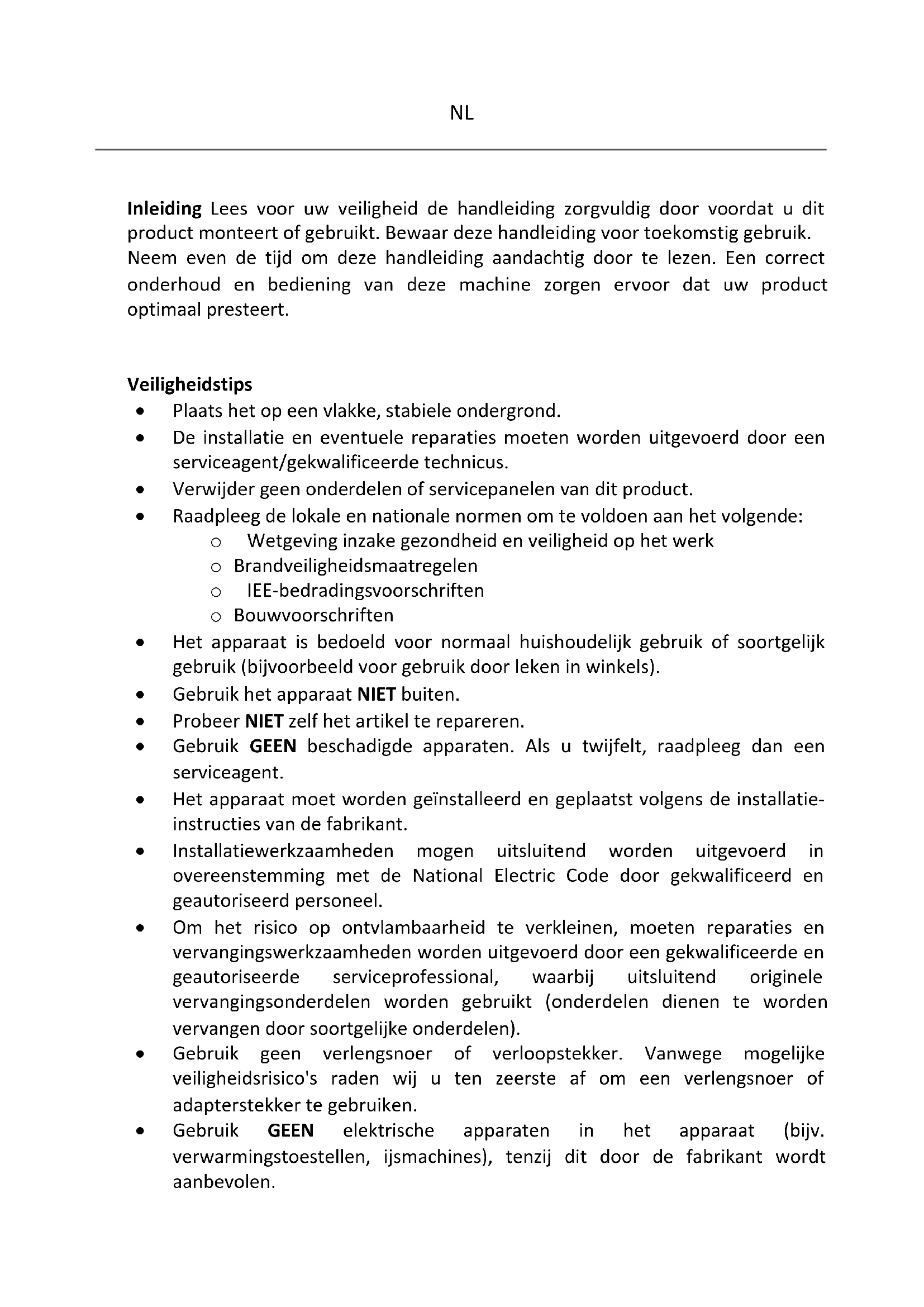 - Om een veilige werking te garanderen, dient u ervoor te zorgen dat het apparaat is opgesteld en aangesloten zoals beschreven in de gebruiksaanwijzing.NL