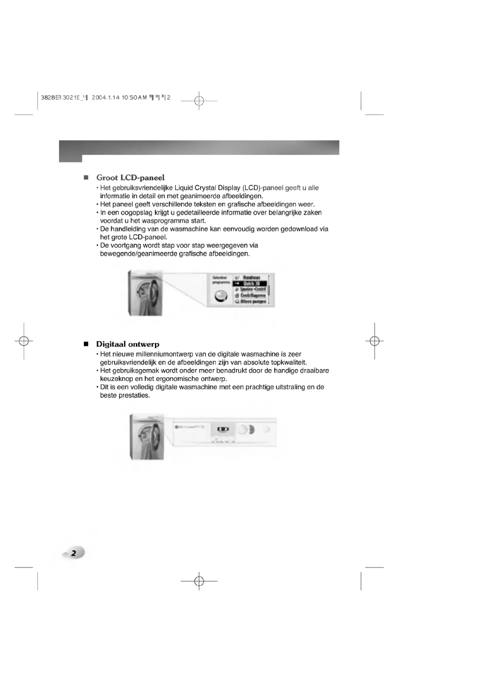 2Groot LCD-paneel ?Het gebruiksvriendelijke Liquid Crystal Display (LCD)-paneel geeft ualleinformatie detailen met geanimeerde afbeeldingen. ?Het paneel geeft verschillendetekstenen grafische afbeeldingen weer.? een oogopslag krijgt gedetailleerde informatieover belangrijke zakenvoordatuhetwasprogramma start. ?De handleiding vandewasmachinekan eenvoudig worden gedownload viahet grote LCD-paneel. ?De voortgang wordt stap voor stap weergegevenvia bewegende/geanimeerde grafische afbeeldingen. Digitaal ontwerp ?Hetnieuwe millenniumontwerp vande digitale wasmachineiszeer gebruiksvriendelijk ende afbeeldingen zijn vanabsolute topkwaliteit. ?Het gebruiksgemak wordtondermeerbenadruktdoorde handige draaibare keuzeknop enhet ergonomische ontwerp. Dit iseen volledig digitale wasmachine met een prachtige uitstraling endebeste prestaties.3 roductkenmerken