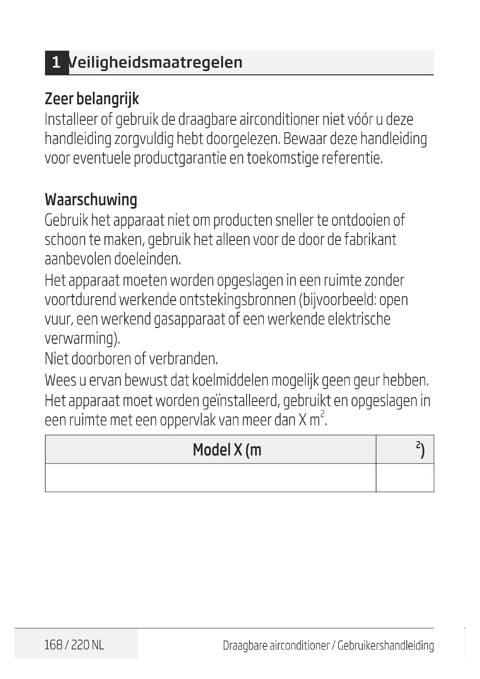 - 9 Onderhoud 214 10 Problemen oplossen 215 11 Opmerkingen voor het milieu 216 12 Installatie-instructies 217 12.1 F-Gas instructie 13 Specificaties 218168 / 220 NL Draagbare airconditioner / Gebruikershandleiding 1 Veiligheidsmaatregelen Zeer belangrijk Installeer of gebruik de draagbare airconditioner niet vóór u deze handleiding zorgvuldig hebt doorgelezen. Bewaar deze handleiding voor eventuele productgarantie en toekomstige referentie. Waarschuwing Gebruik het apparaat niet om producten sneller te ontdooien of schoon te maken, gebruik het alleen voor de door de fabrikant aanbevolen doeleinden. Het apparaat moeten worden opgeslagen in een ruimte zonder voortdurend werkende ontstekingsbronnen (bijvoorbeeld: open vuur, een werkend gasapparaat of een werkende elektrische verwarming). Niet doorboren of verbranden. Wees u ervan bewust dat koelmiddelen mogelijk geen geur hebben. Het apparaat moet worden geïnstalleerd, gebruikt en opgeslagen in een ruimte met een oppervlak van meer dan X m p. 217