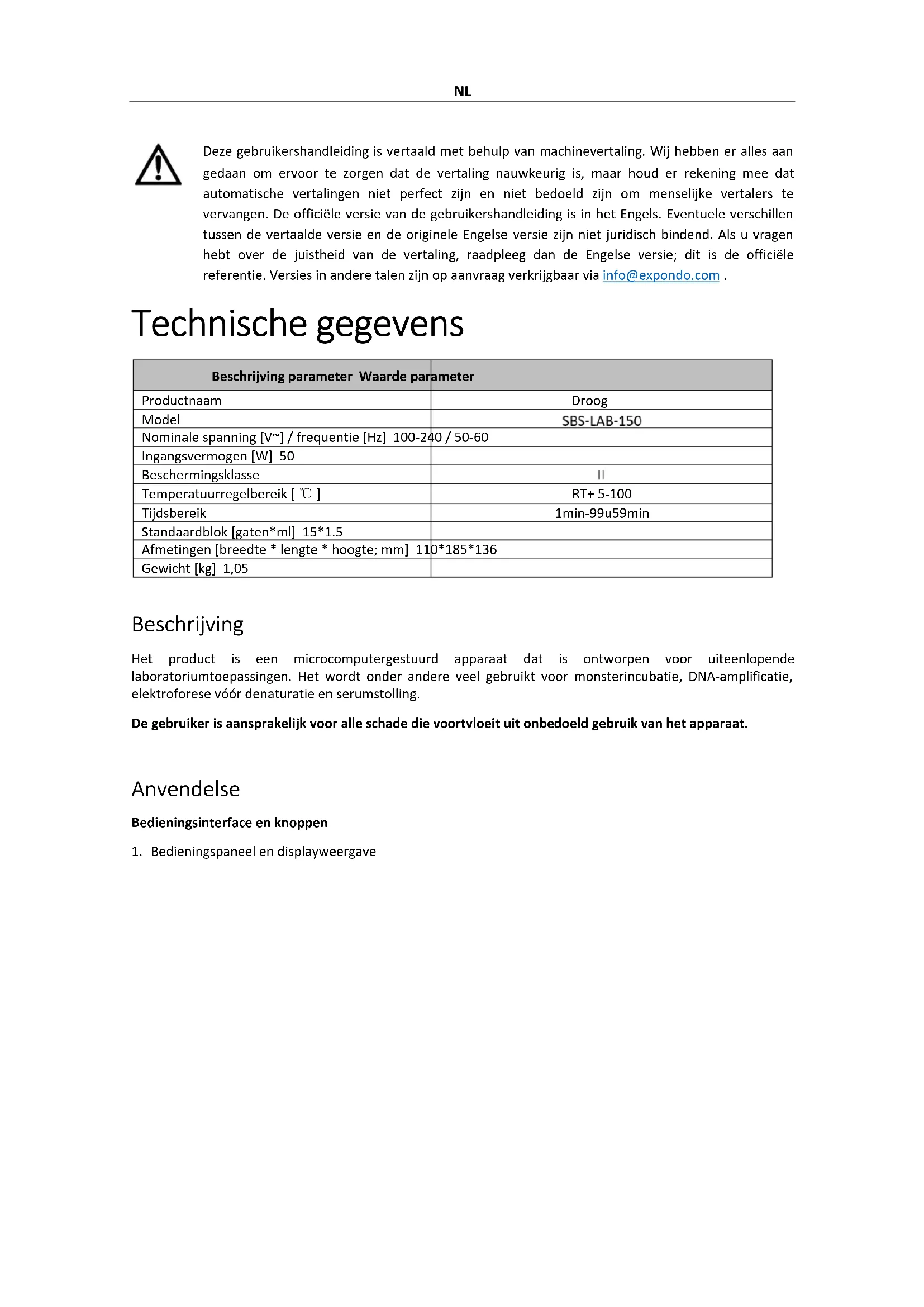 a) Druk op de knop om de temperatuurpunten van S1, S2, S3, S4 en S5 te combineren in programma's voor meerpuntsverbindingen, zoals S1-S2, S1-S2-S3, S1-S2-S3-S4 of S1-S2-S3-S4-S5. KENNISGEVING! Het temperatuurpunt van het multipuntprogramma kan alleen starten vanaf S1. b) Bijvoorbeeld, om een verbindingsprogramma voor S1-S2-S3-S4 in te stellen, drukt u op de knop. Het display toont de huidige configuratie, waarbij S1 het startknooppunt is (dat niet kan worden gewijzigd) en S2 het eindknooppunt (dat wel kan worden aangepast). Druk op de knop om S2 naar S4 te veranderen. Druk dan op knop om de instelling te bevestigen. De knooppuntconfiguratie wordt weergegeven als S1-4 en het programma doorloopt de reeks S1-S2-S3- S4. c) Pers Druk nogmaals op de knop om het vierpuntsverbindingsprogramma S1-S2-S3-S4 uit te voeren.NL Het multi-pointprogramma bedienen KENNISGEVING! Nadat u het eindknooppunt hebt geselecteerd, kunt u op drukken knop om het multi-point programma direct uit te voeren. Reiniging en onderhoud Gebruik een schone, zachte doek die is bevochtigd met een kleine hoeveelheid watervrije alcohol om de taps toelopende gaten in de blokken van het instrument schoon te maken. Hierdoor wordt volledig contact en een efficiënte warmtegeleiding tussen de reageerbuis en de taps toelopende gaten gegarandeerd, terwijl besmetting wordt voorkomen. Als er vlekken op het oppervlak van het instrument ontstaan, reinig het dan met een zachte doek en een milde reinigingspasta. VOORZICHTIGHEID Zorg ervoor dat de stroomtoevoer is uitgeschakeld voordat u het instrument reinigt. Zorg ervoor dat er tijdens het schoonmaken GEEN schoonmaakmiddelen in de taps toelopende gaten terechtkomen. Gebruik geen bijtende schoonmaakmiddelen op het oppervlak van het instrument. Afvoeren van gebruikte apparaten Gooi dit apparaat niet in gemeentelijke afvalsystemen. Lever het in bij een recycling- en verzamelpunt voor elektrische apparaten. Controleer het symbool op het product, de gebruiksaanwijzing en de verpakking. De kunststoffen die voor de productie van het apparaat zijn gebruikt, kunnen volgens de markeringen worden gerecycled. Door te kiezen voor recycling levert u een belangrijke bijdrage aan de bescherming van het milieu. Neem contact op met plaatselijke autoriteiten voor informatie over plaatselijke recycling.NO Denne brukerhåndboken er oversatt ved hjelp av maskinoversettelse. Vi har gjort vårt ytterste for å sikre at oversettelsen er nøyaktig, men vær oppmerksom på at automatiserte oversettelser ikke er perfekte og ikke er ment å erstatte menneskelige oversettere. Den offisielle versjonen av brukerhåndboken er på engelsk. Eventuelle forskjeller mellom den oversatte versjonen og den originale engelske versjonen er ikke juridisk bindende. Hvis du har spørsmål om nøyaktigheten av oversettelsen, vennligst se den engelske versjonen, som er den offisielle referansen. Flere språkversjoner er tilgjengelig på forespørsel via info@expondo.com . Tekniske data Beskrivelse av parameter Parameterverdi Produktnavn Tørrbad Modell Nominell spenning [V~] / frekvens [Hz] 100-240 / 50-60 Inngangseffekt [W] 50 Beskyttelsesklasse Temperaturkontrollområde [ ℃ ] RT + 5-100 Tidsrekkevidde 1min-99t59min Standard blokk [hull*ml] 15*1.5 Dimensjoner [bredde * lengde * høyde; mm] 110*185*136 Vekt [kg] 1.05 Beskrivelse Produktet er en mikrodatamaskinstyrt enhet designet for en rekke laboratorieapplikasjoner. Det er mye brukt for prøveinkubasjon, DNA-amplifisering, elektroforese pre-denaturering og serumstørkning, blant andre prosedyrer. Brukeren er ansvarlig for skader som oppstår som følge av utilsiktet bruk av apparatet. Bruk Betjeningsgrensesnitt og knapper