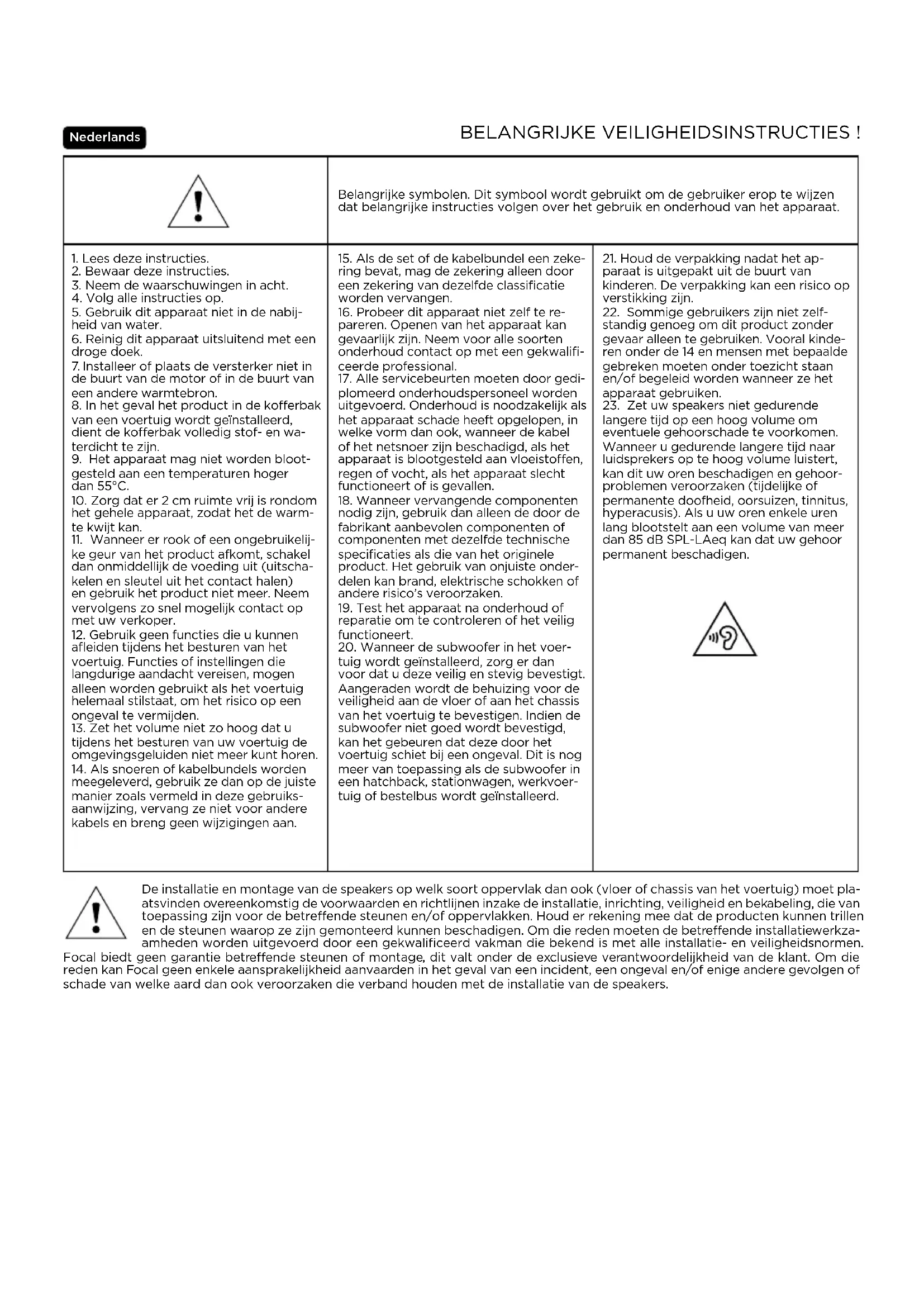 BMW v2 Manual de utilização Período de rodagem Os altifalantes são elementos mecânicos complexos que requerem um período de adaptação para funcionarem da melhor forma possível. Este período de rodagem varia conforme as condições observadas e pode prolongar-se durante algumas semanas. Para acelerar esta operação, recomenda-se que ponha os altifalantes a funcionar durante cerca de vinte horas, no nível médio. Logo que as características dos altifalantes estejam totalmente estabilizadas, poderá desfrutar integralmente do desempenho dos produtos. Condições de garantia Todas as colunas Focal estão cobertas pela garantia elaborada pelo distribuidor oficial da Focal no seu país. O seu distribuidor pode fornecer-lhe todas as informações relativas às condições da garantia. A cobertura da garantia abrange pelo menos o concedido pela garantia legal em vigor no país onde a fatura de compra original foi emitida.BELANGRIJKE VEILIGHEIDSINSTRUCTIES ! Nederlands De installatie en montage van de speakers op welk soort oppervlak dan ook (vloer of chassis van het voertuig) moet pla- atsvinden overeenkomstig de voorwaarden en richtlijnen inzake de installatie, inrichting, veiligheid en bekabeling, die van toepassing zijn voor de betreende steunen en/of oppervlakken. Houd er rekening mee dat de producten kunnen trillen en de steunen waarop ze zijn gemonteerd kunnen beschadigen. Om die reden moeten de betreende installatiewerkza- amheden worden uitgevoerd door een gekwalificeerd vakman die bekend is met alle installatie- en veiligheidsnormen. Focal biedt geen garantie betreende steunen of montage, dit valt onder de exclusieve verantwoordelijkheid van de klant. Om die reden kan Focal geen enkele aansprakelijkheid aanvaarden in het geval van een incident, een ongeval en/of enige andere gevolgen of schade van welke aard dan ook veroorzaken die verband houden met de installatie van de speakers. Belangrijke symbolen. Dit symbool wordt gebruikt om de gebruiker erop te wijzen dat belangrijke instructies volgen over het gebruik en onderhoud van het apparaat.