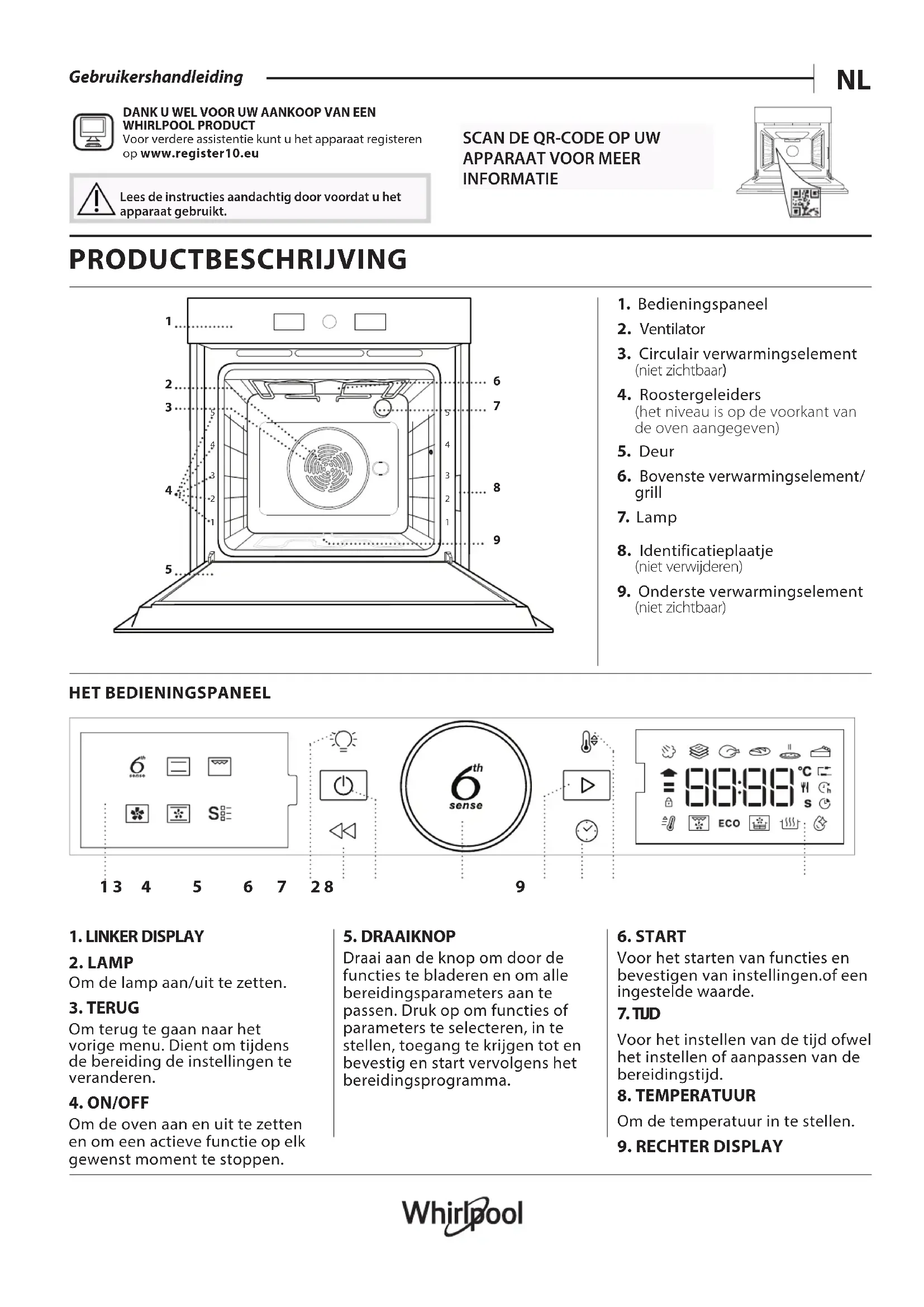 u het op, trekt u het voorzichtig naar u toe en legt u het op de daarvoor bestemde steunen aan de zijkant.NO Eierens håndbok TAKK FOR AT DU KJØPTE ET WHIRLPOOL-PRODUKT For å oppnå en mer utfyllende assistanse, registrer produktet ditt på www . register10 . eu Før du bruker apparatet må du lese sikkerhetsanvisningene nøye. PRODUKTBESKRIVELSE KONTROLLPANEL