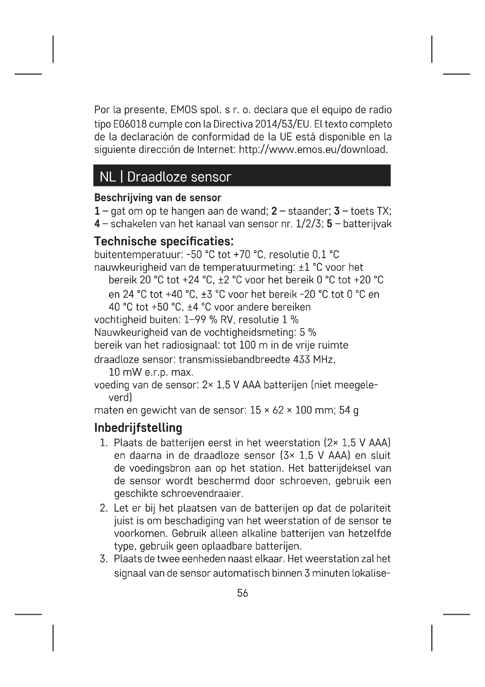 Het apparaat en de batterij worden na gebruik gevaarlijk afval, gooi ze niet bij het gewone huisvuil, maar breng ze naar een inzamelpunt – bv. de winkel waar u het apparaat heeft gekocht. Deponeer niet bij het huisvuil. Gebruik speciale inzamelpun- ten voor gesorteerd afval. Neem contact op met de lokale autoriteiten voor informatie over inzamelpunten. Als de elektronische apparaten zouden worden weggegooid op stortplaat- sen kunnen gevaarlijke stoen in het grondwater terecht komen en vervolgens in de voedselketen, waar het de menselijke gezond- heid kan beïnvloeden. Hierbij verklaart EMOS spol. s r. o. dat de radioapparatuur van het type E06018 in overeenstemming is met de richtlijn 2014/53/EU. De volledige tekst van de EU-conformiteitsverklaring is beschikbaar op het volgende internetadres: http://www.emos.eu/download.60 GARANCIJSKA IZJAVA