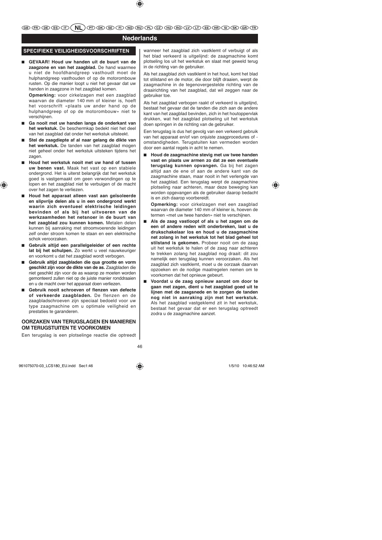 Houd de zaagmachine stevig met uw twee handen vast en plaats uw armen zo dat ze een eventuele terugslag kuren opvangen. Ga bij het zagen.altijd aan de ene of aan de andere Kant van de zaagmachine staan, maar nooit in het verlangde van het zaagblad. Een terugslag werpt de zaagmachine plotselingaar achefteren, maar deze beweging kan worden opgevangen als de gebruiker waarop bedacht is en zich waarop voorbereidt.