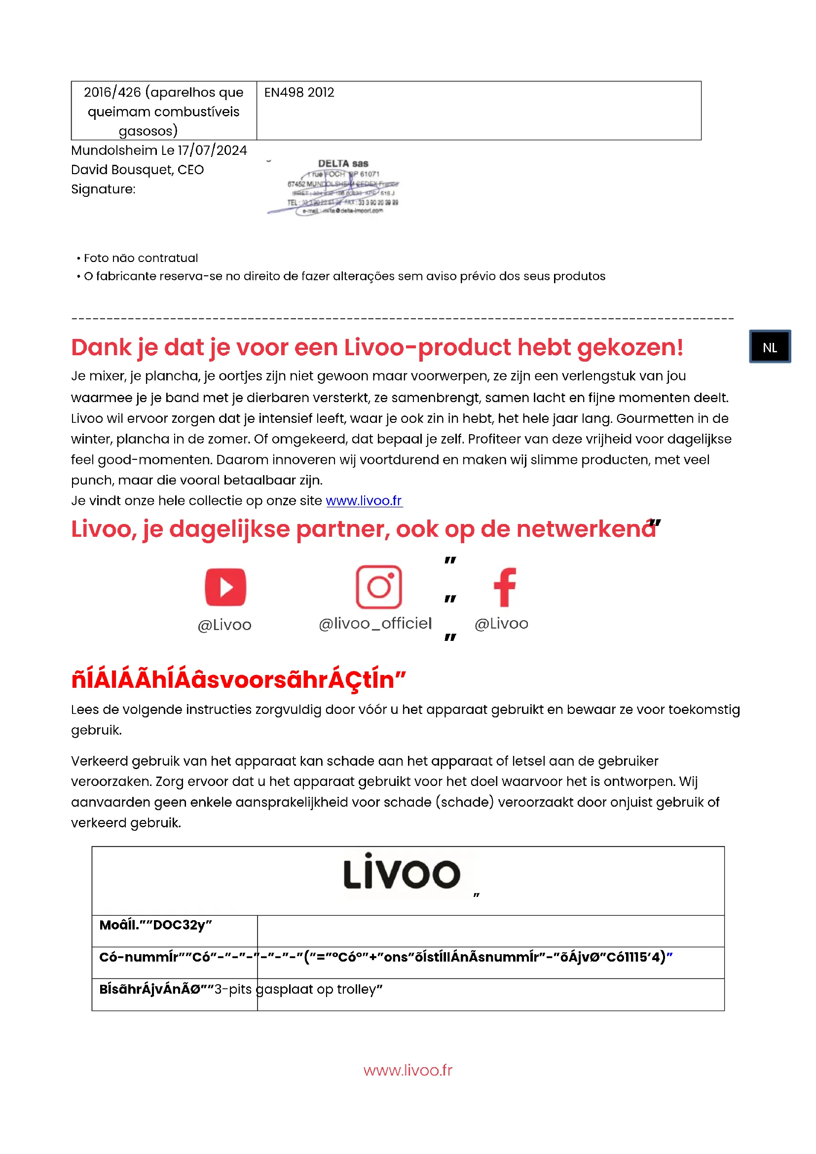 - Gebruik geen ontstekingsproduct bij het onsteken van het apparaat. Montage RAADPLEEG HET DOCUMENT VOOR CHECK GEZAMELIJKE MONTAGE Voor gebruik: Controleer of de slang inkepingen, scheuren of tekenen van zware slijtage vertoont. Zorg ervoor dat de vervaldatum niet wordt overschreden. Voer een lektest uit aan het begin van elk seizoen en elke flesvervanging om de goede werking van uw apparaat en de verbindingen ervan te garanderen. GEBRUIK NOOIT EEN OPEN VLAM OM GASLEKKEN TE DETECTEREN. STEEK HET APPARAAT NIET AAN TIJDENS DE TEST. Stel alle bedieningselementen van het apparaat in op uit (UIT), sluit uw gasfles correct aan, Open de gasflesklep. Om een lek te detecteren, brengt u met een borstel een oplossing van gelijke delen vloeibare zeep en water aan op alle aansluitingen in het gascircuit (kleppen, slang, regelaar en zeskantmoer). Als er ergens bubbels ontstaan, duidt dat op een lek. Gasfles Het apparaat kan worden gebruikt met elke gasfles met gewichten tussen 4,5 kg en 15 kg butaan en 3,9 kg tot 13 kg propaan. De gasfles niet laten vallen of ruw behandelen! Als het apparaat niet in gebruik is, moet de cilinder worden losgekoppeld. Vervang de beschermkap op de cilinder nadat u de cilinder van het apparaat hebt losgekoppeld. Het maximale gewicht van de cilinder is 6,75 KG. Cilinders moeten buiten rechtop en buiten het bereik van kinderen worden opgeslagen. De cilinder mag nooit worden opgeslagen waar de temperatuur kan oplopen tot meer dan 50°C. Bewaar de cilinder niet in de buurt van vlammen, waakvlammen of andere ontstekingsbronnen. NIET ROKEN IN DE BUURT VAN HET APPARAAT. De cilinder moet uit de buurt van elke ontstekingsbron worden vervangen. De hoogte van de gasfles is onder de 80cm en de breedte is binnen de 35cm. Installatie Sluit de gasflesslang en regelaar aan de linkerkant van de plancha aan. Let erop dat de gasfles uit de buurt van warmte moet worden gehouden en stabiel moet worden geplaatst. De diameter van de buis moet 10 mm zijn. De aanbevolen lengte van de slang mag niet groter zijn dan 1,5 m. Kies een flexibele slang die bestand is tegen hitte boven de 80 De gasfles aansluiten op het apparaat Dit apparaat is uitsluitend geschikt voor gebruik met lagedrukbutaan, propaan of hun menggas en wordt gebruikt met de juiste lagedrukregelaar via een flexibele slang. De slang moet met slangclips aan de regelaar en het apparaat worden bevestigd. - Gebruik van 28-30 mbar regelaar met categorie I3+ voor butaangas en een 37mbar regelaar met categorie I3+ voor propaangas; - Het gebruik van een 28-30mbar regelaar met categorie I3B/P (30);www.livoo.fr - Het gebruik van een 37mbar regelaar met categorie I3B/P (37); - Gebruik van een 50mbar regelaar met categorie I3B/P (50); Gebruik een geschikte regelaar die is gecertificeerd overeenkomstig BSEN 16129:2013:. Contacteer uw LPG-dealer voor informatie over een geschikte regelaar voor de gasfles. Hoe een gasfles los te koppelen Sluit de gasflesklep. Wacht tot de brander uit is. Plaats de veiligheidsdop (indien aanwezig) op de lege fles terug. Controleren op lekken Maak 2-3 vloeibare ounces lekdetectieoplossing door een deel afwasmiddel te mengen met 3 delen water. Zorg ervoor dat de regelklep op de stand "UIT" staat. Sluit de regelaar aan op de cilinder en sluit de regelaar aan met de slang en de gasgrill buiten, zorg ervoor dat de verbindingen veilig zijn en zet het gas aan. Borstel de zeepoplossing op de slang en alle verbindingen. Als er bubbels verschijnen, duidt dat op lekkage, wat voor gebruik moet worden verholpen. Schakel de gastoevoer uit in geval van gaslek. Test opnieuw na het verhelpen van de fout. Zet na het testen het gas bij de cilinder UIT. Als gedetecteerde lekkage niet kan worden verholpen, probeer dan niet om lekkage te verhelpen, maar raadpleeg uw gasleverancier. Regelaar en slang Gebruik uitsluitend regelaars en slang die zijn goedgekeurd voor LPG bij de bovenstaande drukken (zie pagina 6). De levensduur van de regelaar wordt geschat op 10 jaar. Het wordt aanbevolen dat de regelaar binnen 10 jaar na de fabricagedatum wordt vervangen. Het gebruik van de verkeerde regelaar of slang is onveilig; controleer altijd of u de juiste items hebt alvorens de plancha te bedienen. De gebruikte slang moet voldoen aan de voor het land van gebruik geldende norm. De lengte van de slang moet 1,5 meter (maximaal) zijn. Versleten of beschadigde slang moet worden vervangen. Zorg ervoor dat de slang niet wordt geblokkeerd, geknikt of in contact komt met enig ander deel van de plancha dan bij de aansluiting. Vervang de slang wanneer de nationale omstandigheden dit vereisen en/of afhankelijk van de geldigheid. De slang mag niet worden gedraaid of geknikt wanneer deze aan de regelaar en de gasgrill buiten is bevestigd. Geen enkel deel van de slang mag enig deel van het apparaat raken. Plaats de cilinder aan de linkerkant van het apparaat op de maximale afstand die is toegestaan door de slanglengte. Gebruik van het apparaat Tips Grill het eten nooit in vlammen. Vlammen kunnen worden veroorzaakt door vetresten en druipend vet op de branders. Om vlammen te voorkomen, reinig de branders regelmatig, met het apparaat uitgeschakeld en wanneer het apparaat volledig is gekoeld. De branders moeten ALTIJD in de lage stand staan tijdens het koken. Bescherm uw handen tijdens het koken met beschermende handschoenen. Gebruik het apparaat niet bij harde wind. Gebruik geen houtskool of lavasteen. Volg deze instructies correct op om ernstig letsel of materiële schade te voorkomen en om het apparaat in goede staat te houden. Volg zorgvuldig de montage-instructies van het apparaat. Sluit de gasleiding aan op de plancha. Sluit de regelaar aan op de leiding. Sluit de regelaar aan op de gasflesklep volgens de instructies die bij de regelaar zijn geleverd. Draai alle bedieningsknoppen in de uit-stand voordat u de gastoevoer opent. Instructies voor ontsteking: hoofdbranders Sluit de gasfles aan op de plancha volgens de instructies die bij de regelaar zijn geleverd.www.