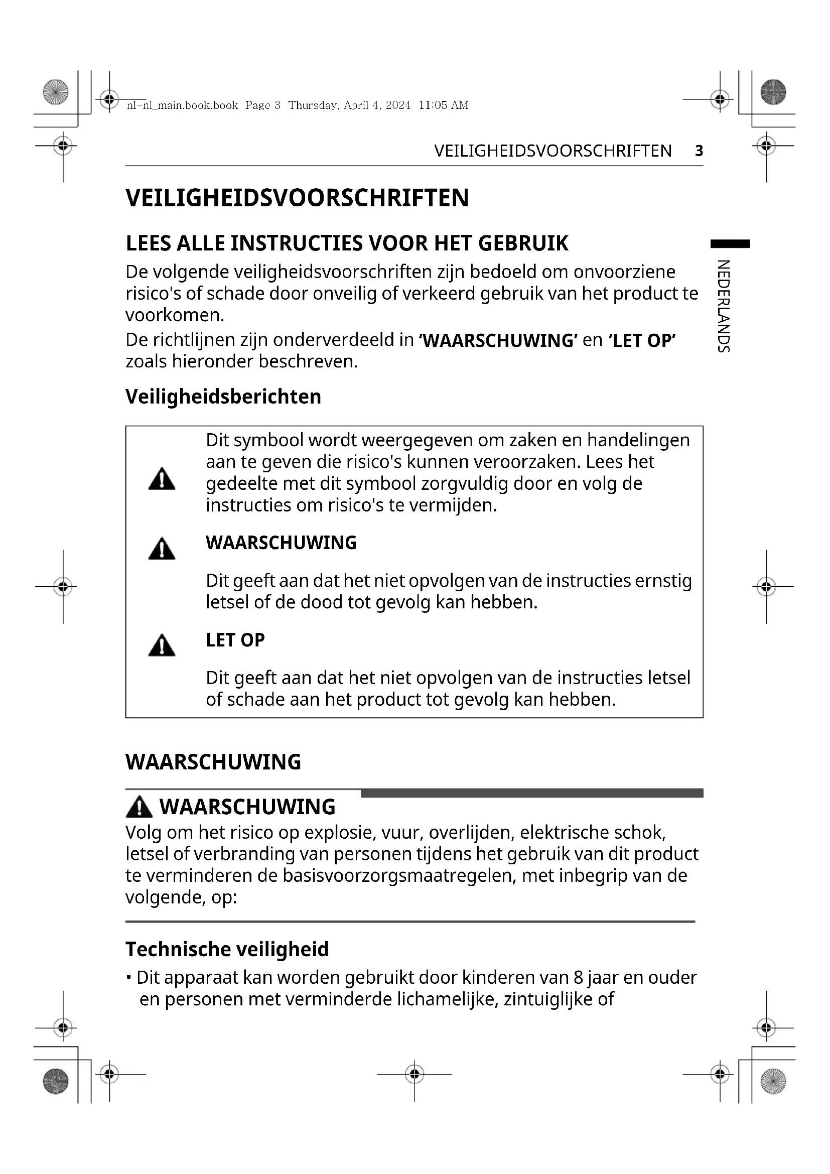 - Dit apparaat kan worden gebruikt door kinderen van 8 jaar en ouder en personen met verminderde lichamelijke, zintuiglijke of Dit symbool wordt weergegeven om zaken en handelingen aan te geven die risico's kunnen veroorzaken. Lees het gedeelte met dit symbool zorgvuldig door en volg de instructies om risico's te vermijden. WAARSCHUWING Dit geeft aan dat het niet opvolgen van de instructies ernstig letsel of de dood tot gevolg kan hebben. LET OP Dit geeft aan dat het niet opvolgen van de instructies letsel of schade aan het product tot gevolg kan hebben. nl-nl_main.book.book Page 3 Thursday, April 4, 2024 11:05 AM4 VEILIGHEIDSVOORSCHRIFTEN verstandelijke vermogens of gebrek aan ervaring en kennis, als ze onder toezicht staan of worden geïnstrueerd over het veilig gebruik van het apparaat en bijbehorende gevaren begrijpen. Kinderen mogen niet met het apparaat spelen. Reiniging en onderhoud door de gebruiker mogen niet worden uitgevoerd door kinderen zonder toezicht.