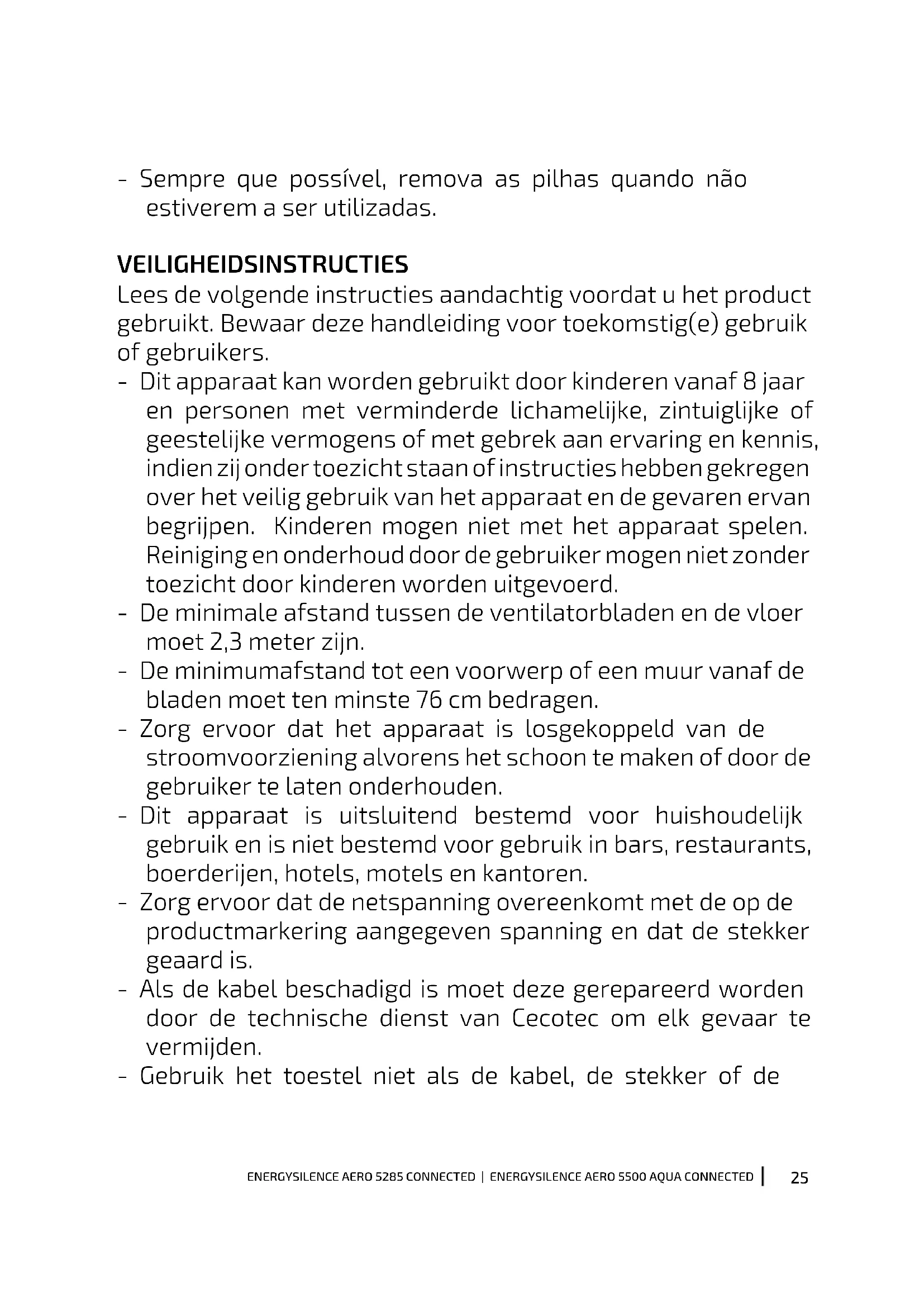 - Sempre que possível, remova as pilhas quando não estiverem a ser utilizadas. VEILIGHEIDSINSTRUCTIES Lees de volgende instructies aandachtig voordat u het product gebruikt. Bewaar deze handleiding voor toekomstig(e) gebruik of gebruikers. - Dit apparaat kan worden gebruikt door kinderen vanaf 8 jaar en personen met verminderde lichamelijke, zintuiglijke of geestelijke vermogens of met gebrek aan ervaring en kennis, indien zij onder toezicht staan of instructies hebben gekregen over het veilig gebruik van het apparaat en de gevaren ervan begrijpen. Kinderen mogen niet met het apparaat spelen. Reiniging en onderhoud door de gebruiker mogen niet zonder toezicht door kinderen worden uitgevoerd. - De minimale afstand tussen de ventilatorbladen en de vloer moet 2,3 meter zijn. - De minimumafstand tot een voorwerp of een muur vanaf de bladen moet ten minste 76 cm bedragen. - Zorg ervoor dat het apparaat is losgekoppeld van de stroomvoorziening alvorens het schoon te maken of door de gebruiker te laten onderhouden. - Dit apparaat is uitsluitend bestemd voor huishoudelijk gebruik en is niet bestemd voor gebruik in bars, restaurants, boerderijen, hotels, motels en kantoren. - Zorg ervoor dat de netspanning overeenkomt met de op de productmarkering aangegeven spanning en dat de stekker geaard is. - Als de kabel beschadigd is moet deze gerepareerd worden door de technische dienst van Cecotec om elk gevaar te vermijden. - Gebruik het toestel niet als de kabel, de stekker of de26 ENERGYSILENCE AERO 5285 CONNECTED | ENERGYSILENCE AERO 5500 AQUA CONNECTED behuizing beschadigd zijn of niet correct werken of als ze gevallen zijn. - Het apparaat moet geïnstalleerd worden in overeenkomst met de nationale regelgeving omtrent elektrische installaties. - Steek geen objecten of lichaamsdelen in de bladen als ze bewegen. - Bevestig de ventilator direct aan de ondersteunende structuur van het gebouw zoals beschreven in deze handleiding en gebruik enkel onderdelen en componenten die geleverd worden door Cecotec om het risico op beschadigingen te verkleinen. - Om het risico van een elektrische schok te voorkomen, moet u de hoofdstroom uitschakelen door de stroomschakelaars uit te schakelen voordat u de ventilator installeert of repareert. - De kabels moeten voldoen aan de nationale elektrische voorschriften. - De kabel moet goed geaard zijn om het risico van mogelijke ongelukken te voorkomen. - Het apparaat moet geïnstalleerd worden in overeenkomst met de nationale regelgeving omtrent elektrische installaties. - Installeer de ventilator nooit in een ruimte met een hoge luchtvochtigheid. - Wees zeer voorzichtig als u in de buurt van de ventilatorbladen bent. - Om de snelheid van de ventilatorbladen te regelen, kunt u gebruik maken van de snelheidsregelaar van Cecotec. - Vouw en buig niet het grijpsysteem van de bladen tijdens de installatie of het schoonmaken. - De reiniging en het onderhoud van het productENERGYSILENCE AERO 5285 CONNECTED | ENERGYSILENCE AERO 5500 AQUA CONNECTED