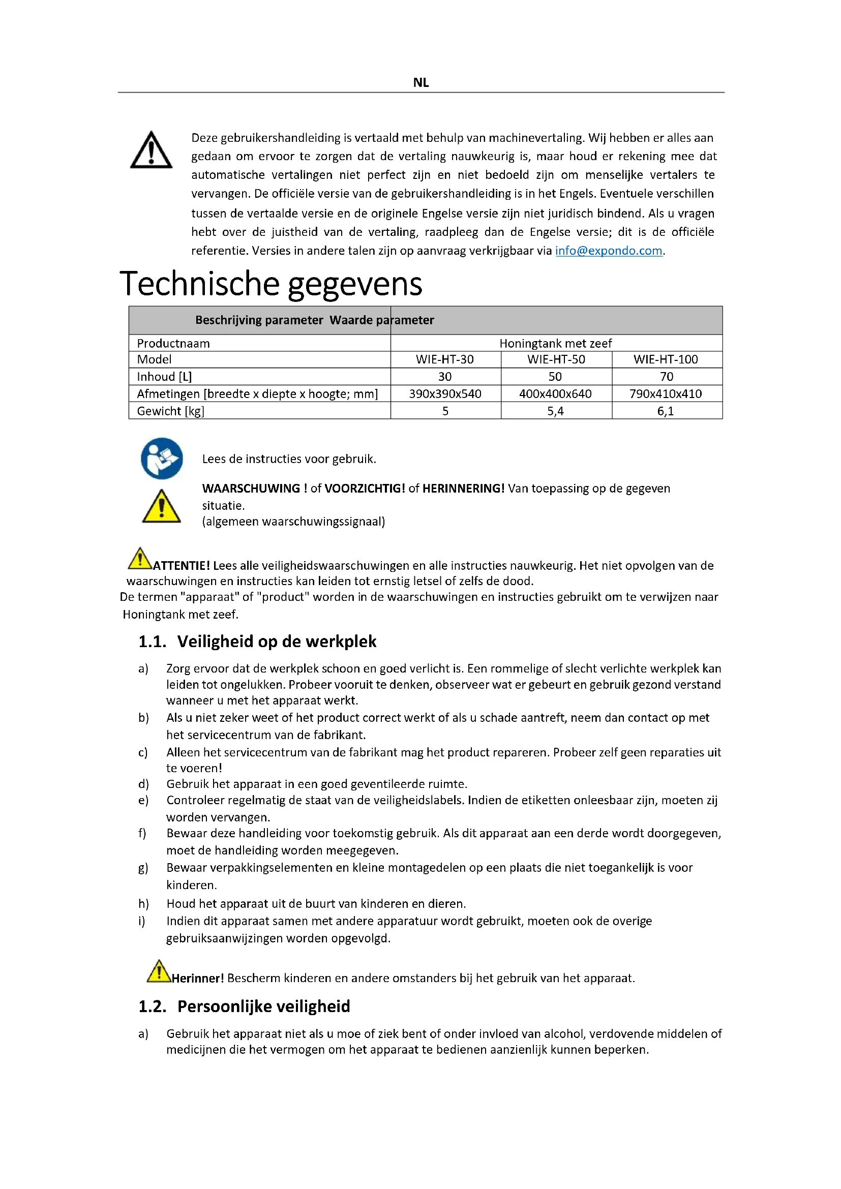 verdunners, brandstof, olie of andere chemische stoffen, omdat dit het apparaat kan beschadigen. VERWIJDERING VAN GEBRUIKTE APPARATEN: Gooi dit apparaat niet in gemeentelijke afvalsystemen. Lever het in bij een recycling- en verzamelpunt voor elektrische apparaten. Controleer het symbool op het product, de gebruiksaanwijzing en de verpakking. De kunststoffen die voor de bouw van het apparaat zijn gebruikt, kunnen overeenkomstig hun markering worden gerecycleerd. Door te kiezen voor recycling levert u een belangrijke bijdrage aan de bescherming van het milieu. Neem contact op met plaatselijke autoriteiten voor informatie over plaatselijke recycling.NO Denne brukerhåndboken er oversatt ved hjelp av maskinoversettelse. Vi har gjort vårt ytterste for å sikre at oversettelsen er nøyaktig, men vær oppmerksom på at automatiserte oversettelser ikke er perfekte og ikke er ment å erstatte menneskelige oversettere. Den offisielle versjonen av brukerhåndboken er på engelsk. Eventuelle forskjeller mellom den oversatte versjonen og den originale engelske versjonen er ikke juridisk bindende. Hvis du har spørsmål om nøyaktigheten av oversettelsen, vennligst se den enge lske versjonen, som er den offisielle referansen. Flere språkversjoner er tilgjengelig på forespørsel via info@expondo.com. Tekniske data Beskrivelse av parameter Parameterverdi Produktnavn Honningtank med sil Modell WIE-HT-30 WIE-HT-50 WIE-HT-100 Kapasitet [L]