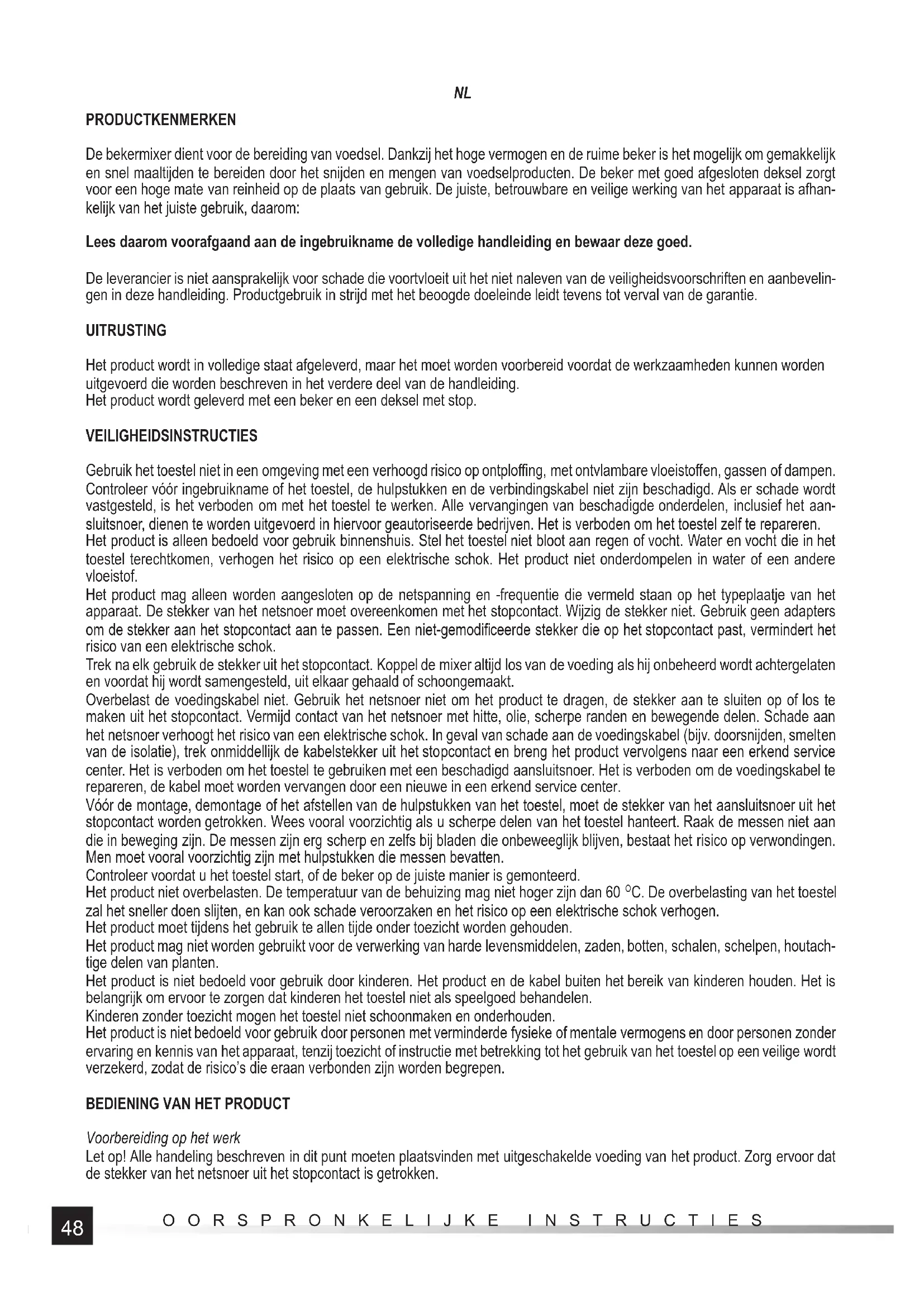OORSPRONKELIJKE INSTRUCTIES PRODUCTKENMERKEN De bekermixer dient voor de bereiding van voedsel. Dankzij het hoge vermogen en de ruime beker is het mogelijk om gemakkelijk en snel maaltijden te bereiden door het snijden en mengen van voedselproducten. De beker met goed afgesloten deksel zorgt voor een hoge mate van reinheid op de plaats van gebruik. De juiste, betrouwbare en veilige werking van het apparaat is afhan- kelijk van het juiste gebruik, daarom: Lees daarom voorafgaand aan de ingebruikname de volledige handleiding en bewaar deze goed. De leverancier is niet aansprakelijk voor schade die voortvloeit uit het niet naleven van de veiligheidsvoorschriften en aanbevelin- gen in deze handleiding. Productgebruik in strijd met het beoogde doeleinde leidt tevens tot verval van de garantie. UITRUSTING Het product wordt in volledige staat afgeleverd, maar het moet worden voorbereid voordat de werkzaamheden kunnen worden uitgevoerd die worden beschreven in het verdere deel van de handleiding. Het product wordt geleverd met een beker en een deksel met stop. VEILIGHEIDSINSTRUCTIES Gebruik het toestel niet in een omgeving met een verhoogd risico op ontploffi ng, met ontvlambare vloeistoff en, gassen of dampen. Controleer vóór ingebruikname of het toestel, de hulpstukken en de verbindingskabel niet zijn beschadigd. Als er schade wordt vastgesteld, is het verboden om met het toestel te werken. Alle vervangingen van beschadigde onderdelen, inclusief het aan- sluitsnoer, dienen te worden uitgevoerd in hiervoor geautoriseerde bedrijven. Het is verboden om het toestel zelf te repareren. Het product is alleen bedoeld voor gebruik binnenshuis. Stel het toestel niet bloot aan regen of vocht. Water en vocht die in het toestel terechtkomen, verhogen het risico op een elektrische schok. Het product niet onderdompelen in water of een andere vloeistof. Het product mag alleen worden aangesloten op de netspanning en -frequentie die vermeld staan op het typeplaatje van het apparaat. De stekker van het netsnoer moet overeenkomen met het stopcontact. Wijzig de stekker niet. Gebruik geen adapters om de stekker aan het stopcontact aan te passen. Een niet-gemodifi ceerde stekker die op het stopcontact past, vermindert het risico van een elektrische schok. Trek na elk gebruik de stekker uit het stopcontact. Koppel de mixer altijd los van de voeding als hij onbeheerd wordt achtergelaten en voordat hij wordt samengesteld, uit elkaar gehaald of schoongemaakt. Overbelast de voedingskabel niet. Gebruik het netsnoer niet om het product te dragen, de stekker aan te sluiten op of los te maken uit het stopcontact. Vermijd contact van het netsnoer met hitte, olie, scherpe randen en bewegende delen. Schade aan het netsnoer verhoogt het risico van een elektrische schok. In geval van schade aan de voedingskabel (bijv. doorsnijden, smelten van de isolatie), trek onmiddellijk de kabelstekker uit het stopcontact en breng het product vervolgens naar een erkend service center. Het is verboden om het toestel te gebruiken met een beschadigd aansluitsnoer. Het is verboden om de voedingskabel te repareren, de kabel moet worden vervangen door een nieuwe in een erkend service center. Vóór de montage, demontage of het afstellen van de hulpstukken van het toestel, moet de stekker van het aansluitsnoer uit het stopcontact worden getrokken. Wees vooral voorzichtig als u scherpe delen van het toestel hanteert. Raak de messen niet aan die in beweging zijn. De messen zijn erg scherp en zelfs bij bladen die onbeweeglijk blijven, bestaat het risico op verwondingen. Men moet vooral voorzichtig zijn met hulpstukken die messen bevatten. Controleer voordat u het toestel start, of de beker op de juiste manier is gemonteerd. Het product niet overbelasten. De temperatuur van de behuizing mag niet hoger zijn dan 60