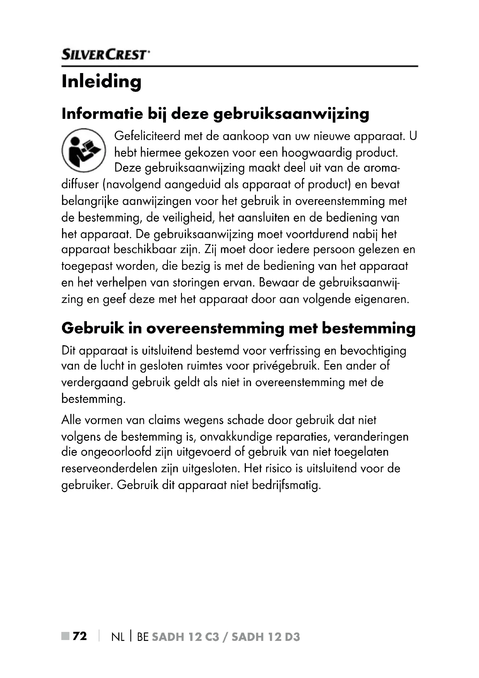 Inleiding Informatie bij deze gebruiksaanwijzing Gefeliciteerd met de aankoop van uw nieuwe apparaat. U hebt hiermee gekozen voor een hoogwaardig product. Deze gebruiksaanwijzing maakt deel uit van de aroma- diffuser (navolgend aangeduid als apparaat of product) en bevat belangrijke aanwijzingen voor het gebruik in overeenstemming met de bestemming, de veiligheid, het aansluiten en de bediening van het apparaat. De gebruiksaanwijzing moet voortdurend nabij het apparaat beschikbaar zijn. Zij moet door iedere persoon gelezen en toegepast worden, die bezig is met de bediening van het apparaat en het verhelpen van storingen ervan. Bewaar de gebruiksaanwij- zing en geef deze met het apparaat door aan volgende eigenaren. Gebruik in overeenstemming met bestemming Dit apparaat is uitsluitend bestemd voor verfrissing en bevochtiging van de lucht in gesloten ruimtes voor privégebruik. Een ander of verdergaand gebruik geldt als niet in overeenstemming met de bestemming. Alle vormen van claims wegens schade door gebruik dat niet volgens de bestemming is, onvakkundige reparaties, veranderingen die ongeoorloofd zijn uitgevoerd of gebruik van niet toegelaten reserveonderdelen zijn uitgesloten. Het risico is uitsluitend voor de gebruiker. Gebruik dit apparaat niet bedrijfsmatig.NL