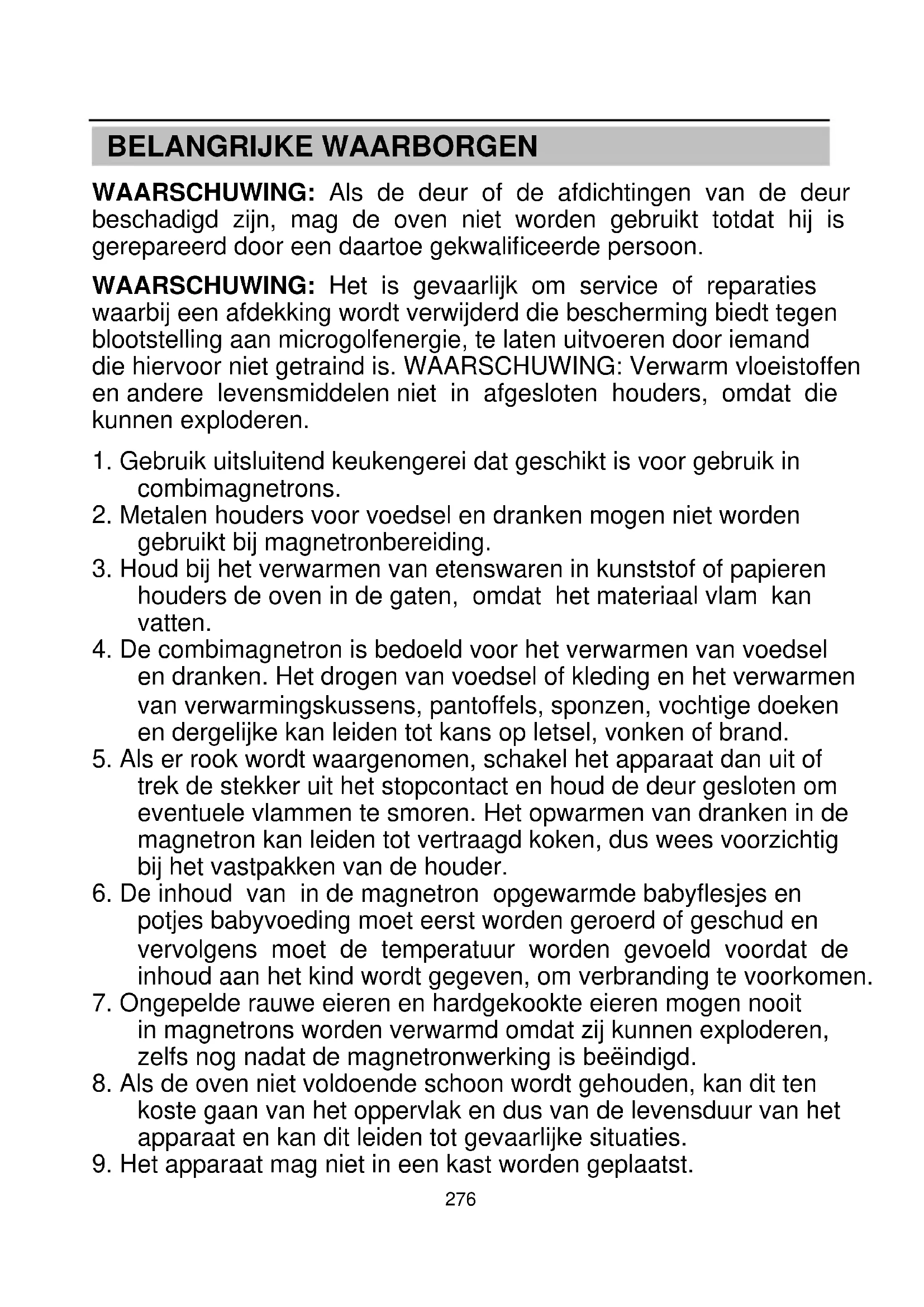+276 BELANGRIJKE WAARBORGEN WAARSCHUWING: Als de deur of de afdichtingen van de deur beschadigd zijn, mag de oven niet worden gebruikt totdat hij is gerepareerd door een daartoe gekwalificeerde persoon. WAARSCHUWING: Het is gevaarlijk om service of reparaties waarbij een afdekking wordt verwijderd die bescherming biedt tegen blootstelling aan microgolfenergie, te laten uitvoeren door iemand die hiervoor niet getraind is. WAARSCHUWING: Verwarm vloeistoffen en andere levensmiddelen niet in afgesloten houders, omdat die kunnen exploderen.