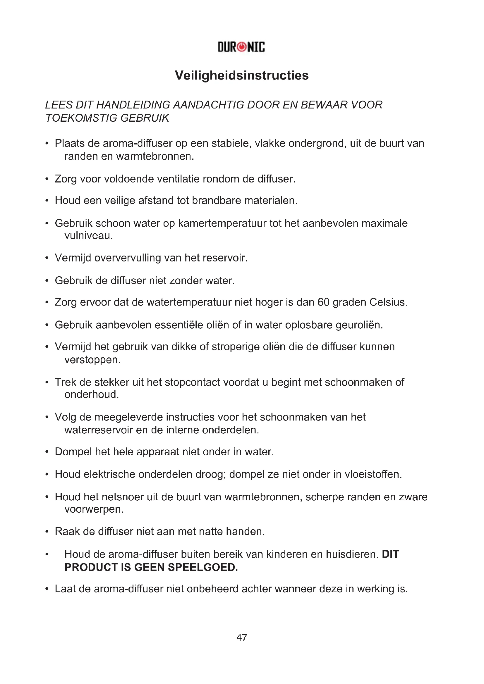 - Houd de aroma-diuser buiten bereik van kinderen en huisdieren. DIT PRODUCT IS GEEN SPEELGOED.