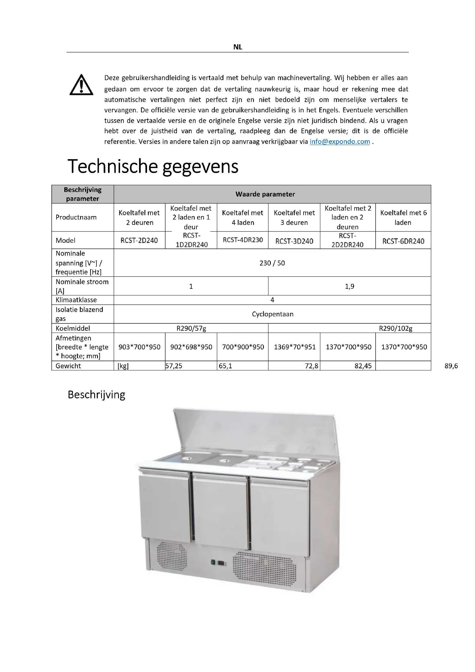 | Productnaam | Koeltafel met 2 deuren | Koeltafel met 2 laden en 1 deur | Koeltafel met 4 laden | Koeltafel met 3 deuren | Koeltafel met 2 laden en 2 deuren | Koeltafel met 6 laden |