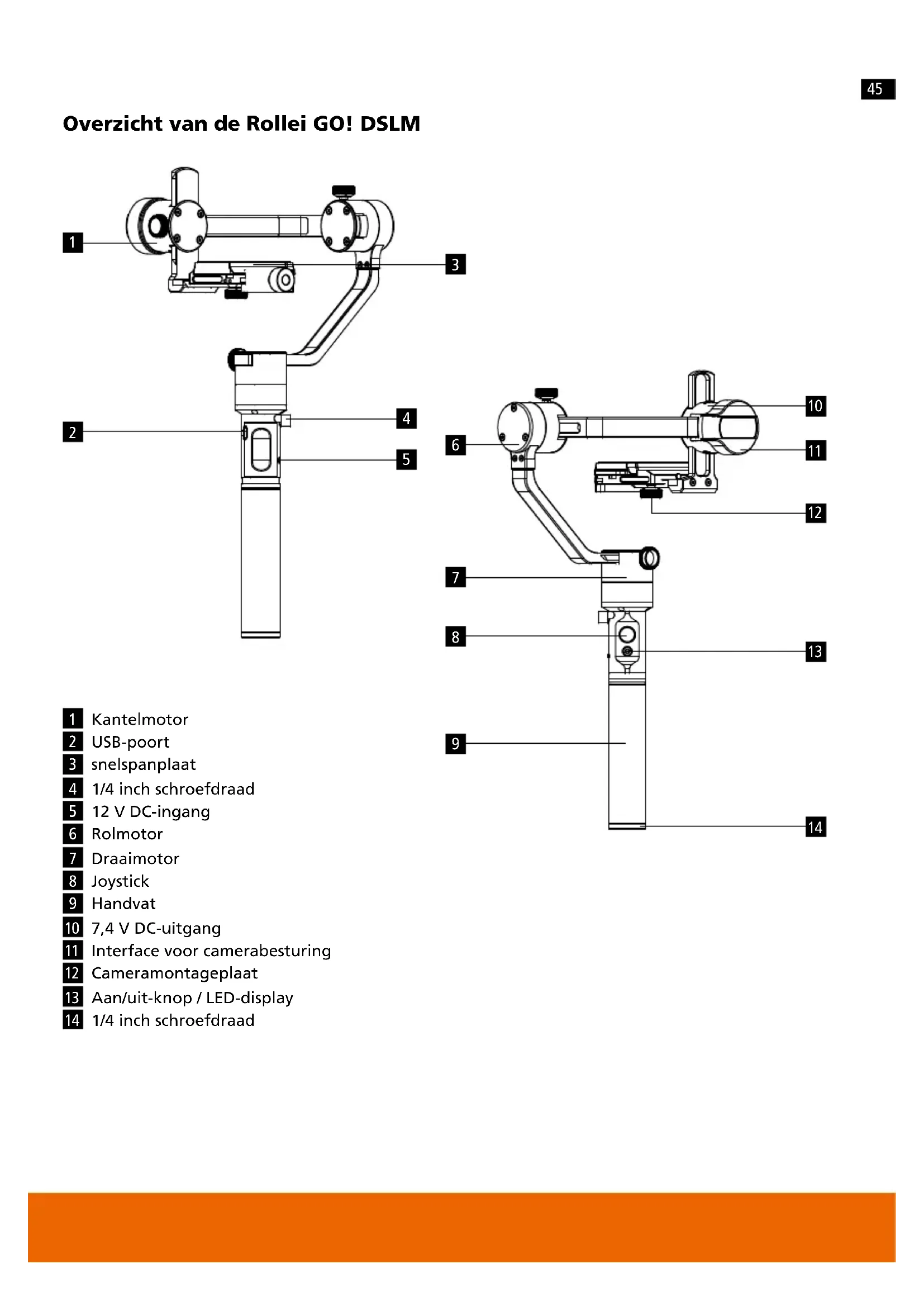 Overzicht van de Rollei GO! DSLM Kantelmotor USB-poort snelspanplaat 1/4 inch schroefdraad 12 V DC-ingang Rolmotor Draaimotor Joystick Handvat 7,4 V DC-uitgang Interface voor camerabesturing Cameramontageplaat Aan/uit-knop / LED-display 1/4 inch schroefdraad