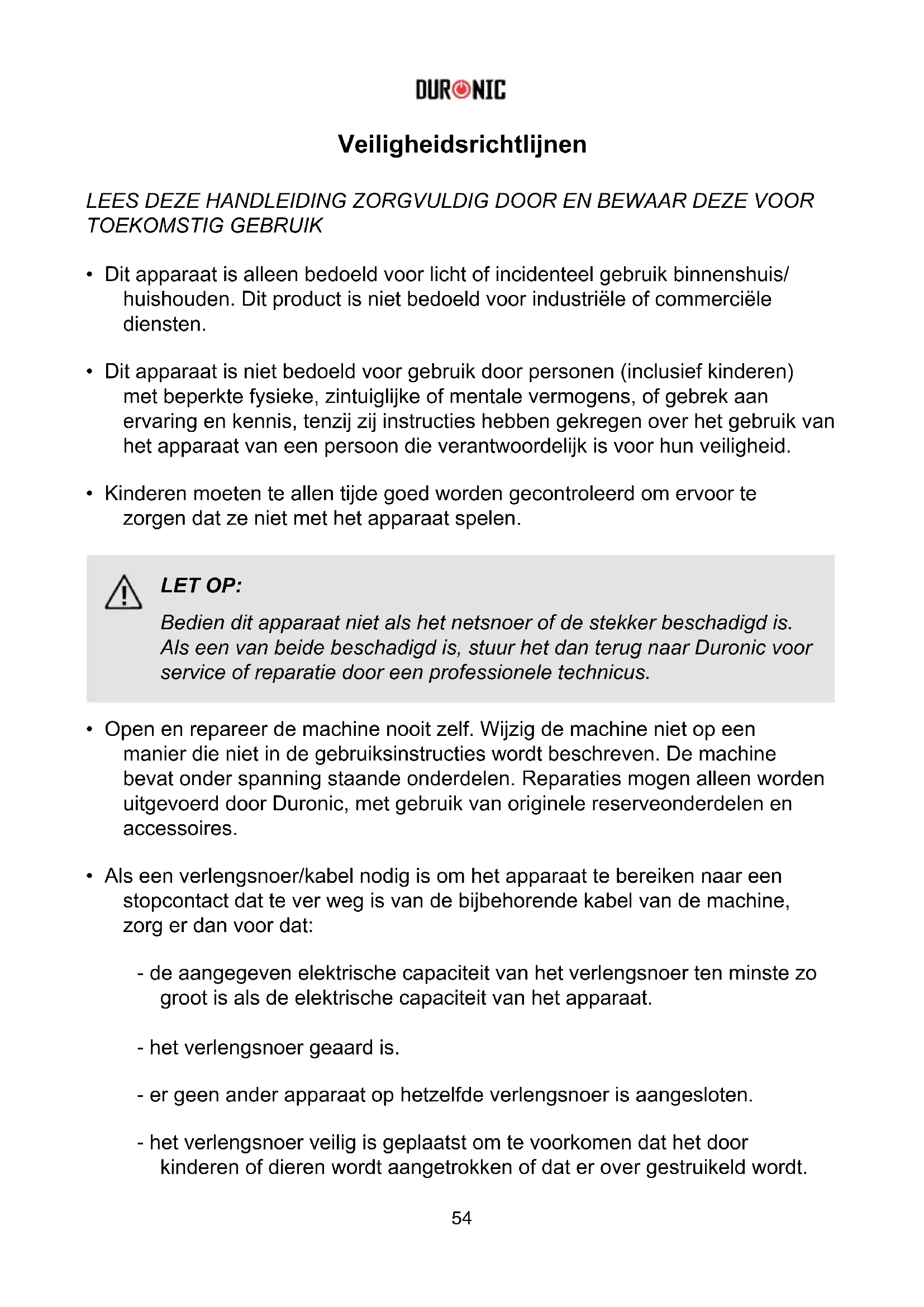 - Als een verlengsnoer/kabel nodig is om het apparaat te bereiken naar een stopcontact dat te ver weg is van de bijbehorende kabel van de machine, zorg er dan voor dat: - de aangegeven elektrische capaciteit van het verlengsnoer ten minste zo groot is als de elektrische capaciteit van het apparaat. - het verlengsnoer geaard is. - er geen ander apparaat op hetzelfde verlengsnoer is aangesloten. - het verlengsnoer veilig is geplaatst om te voorkomen dat het door kinderen of dieren wordt aangetrokken of dat er over gestruikeld wordt. LET OP: Bedien dit apparaat niet als het netsnoer of de stekker beschadigd is. Als een van beide beschadigd is, stuur het dan terug naar Duronic voor service of reparatie door een professionele technicus.55 Veiligheidsrichtlijnen