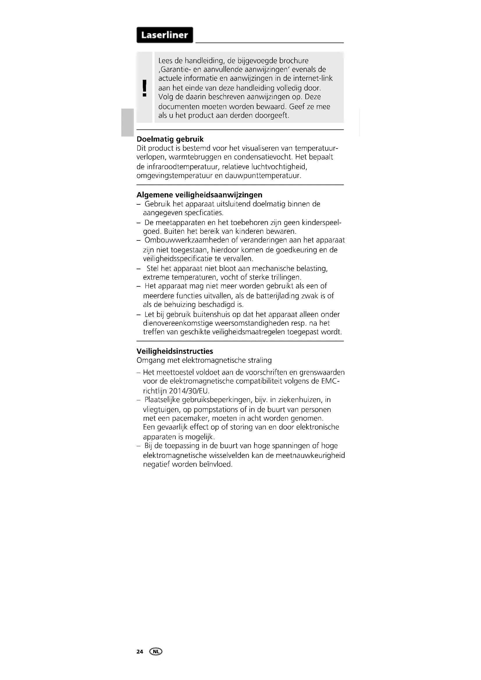 - % rH Accuracy Humidity +/-2% (20% % rH) +/-3% (<20% & >80%) Memory Micro-SD memory card up to 32 GB Protection class IP 54 Connections 1/4" tripod thread USB type C Auto power off adjustable Power supply Li-ion battery pack 3,6V / 2,55Ah Operating time approx. 4 hours Charging time approx. 2.5 hours Operating conditions 0°C … 50°C, max. humidity 85% rH, no condensation, max. working altitude 2000 m above sea level Storage conditions -10°C … 60°C, max. humidity 85% rH, no condensation Dimensions (W x H x D) 69 mm x 220 mm x 77 mm Weight 275 g (incl. battery) EU and UK directives and disposal This device complies with all necessary standards for the free movement of goods within the EU and the UK. This product, including accessories and packaging, is an electrical appliance that must be recycled in an environmentally appropriate manner in accordance with European and UK directives on waste electrical and electronic equipment, batteries and packaging, in order to recover valuable raw materials. Electrical devices, batteries and packaging do not belong in household waste. Users are obliged by law to surrender used batteries or battery packs to a public collection point, to sales outlets, or to technical customer services, free of charge. Remove the battery pack from the device without damaging it using standard tools and a separate collection arranged before returning the device for disposal. Please do not hesitate to contact the UMAREX-LASERLINER service department if you have any queries regarding removing the battery. Look for information on local disposal facilities and note the relevant disposal and safety information at the collection points. Further safety and supplementary notices at: https://packd.li/ll/apb/in EN24 Algemene veiligheidsaanwijzingen – Gebruik het apparaat uitsluitend doelmatig binnen de aangegeven speccaties. – De meetapparaten en het toebehoren zn geen kinderspeel- goed. Buiten het bereik van kinderen bewaren. – Ombouwwerkzaamheden of veranderingen aan het apparaat zijn niet toegestaan, hierdoor komen de goedkeuring en de veiligheidsspecicatie te vervallen. – Stel het apparaat niet bloot aan mechanische belasting, extreme temperaturen, vocht of sterke trillingen. – Het apparaat mag niet meer worden gebruikt als een of meerdere functies uitvallen, als de batterijlading zwak is of als de behuizing beschadigd is. – Let bij gebruik buitenshuis op dat het apparaat alleen onder dienovereenkomstige weersomstandigheden resp. na het treffen van geschikte veiligheidsmaatregelen toegepast wordt. Doelmatig gebruik Dit product is bestemd voor het visualiseren van temperatuur- verlopen, warmtebruggen en condensatievocht. Het bepaalt de infraroodtemperatuur, relatieve luchtvochtigheid, omgevingstemperatuur en dauwpunttemperatuur. Lees de handleiding, de bijgevoegde brochure ‚Garantie- en aanvullende aanwijzingen‘ evenals de actuele informatie en aanwijzingen in de internet-link aan het einde van deze handleiding volledig door. Volg de daarin beschreven aanwijzingen op. Deze documenten moeten worden bewaard. Geef ze mee als u het product aan derden doorgeeft. p. 80