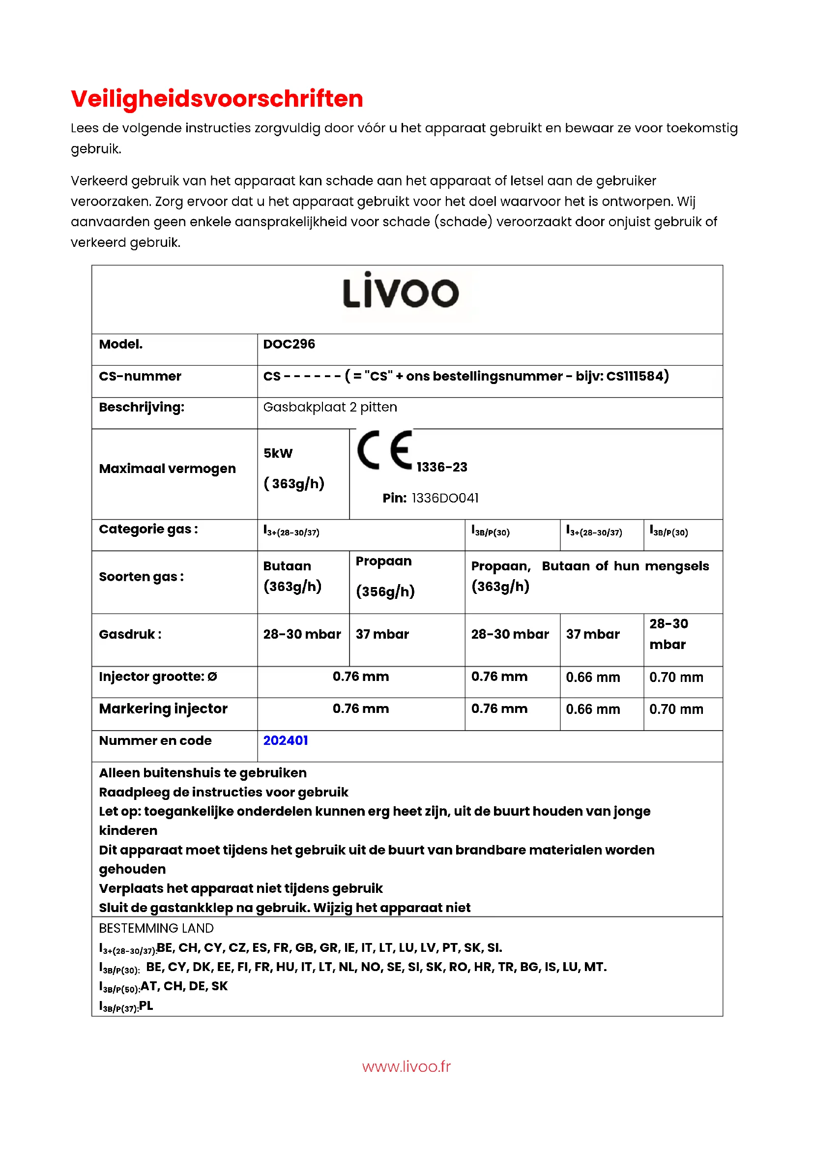 - Gebruik geen ontstekingsproduct bij het onsteken van het apparaat. Montage RAADPLEEG HET DOCUMENT VOOR CHECK GEZAMELIJKE MONTAGE Voor gebruik: Controleer of de slang inkepingen, scheuren of tekenen van zware slijtage vertoont. Zorg ervoor dat de vervaldatum niet wordt overschreden. Voer een lektest uit aan het begin van elk seizoen en elke flesvervanging om de goede werking van uw apparaat en de verbindingen ervan te garanderen. GEBRUIK NOOIT EEN OPEN VLAM OM GASLEKKEN TE DETECTEREN. STEEK HET APPARAAT NIET AAN TIJDENS DE TEST. Stel alle bedieningselementen van het apparaat in op uit (UIT), sluit uw gasfles correct aan, Open de gasflesklep. Om een lek te detecteren, brengt u met een borstel een oplossing van gelijke delen vloeibare zeep en water aan op alle aansluitingen in het gascircuit (kleppen, slang, regelaar en zeskantmoer). Als er ergens bubbels ontstaan, duidt dat op een lek. Gasfles Het apparaat kan worden gebruikt met elke gasfles met gewichten tussen 4,5 kg en 15 kg butaan en 3,9 kg tot 13 kg propaan. De gasfles niet laten vallen of ruw behandelen! Als het apparaat niet in gebruik is, moet de cilinder worden losgekoppeld. Vervang de beschermkap op de cilinder nadat u de cilinder van het apparaat hebt losgekoppeld. Het maximale gewicht van de cilinder is 6,75 KG. Cilinders moeten buiten rechtop en buiten het bereik van kinderen worden opgeslagen. De cilinder mag nooit worden opgeslagen waar de temperatuur kan oplopen tot meer dan 50C. Bewaar de cilinder nietwww.livoo.fr in de buurt van vlammen, waakvlammen of andere ontstekingsbronnen. NIET ROKEN IN DE BUURT VAN HET APPARAAT. De cilinder moet uit de buurt van elke ontstekingsbron worden vervangen. De hoogte van de gasfles is onder de 80cm en de breedte is binnen de 35cm. Installatie Sluit de gasflesslang en regelaar aan de linkerkant van de plancha aan. Let erop dat de gasfles uit de buurt van warmte moet worden gehouden en stabiel moet worden geplaatst. De diameter van de buis moet 10 mm zijn. De aanbevolen lengte van de slang mag niet groter zijn dan 1,5 m. Kies een flexibele slang die bestand is tegen hitte boven de 80 De gasfles aansluiten op het apparaat Dit apparaat is uitsluitend geschikt voor gebruik met lagedrukbutaan, propaan of hun menggas en wordt gebruikt met de juiste lagedrukregelaar via een flexibele slang. De slang moet met slangclips aan de regelaar en het apparaat worden bevestigd. - Gebruik van 28 mbar regelaar met categorie I3+ voor butaangas en een 37mbar regelaar met categorie I3+ voor propaangas; - Het gebruik van een 30mbar regelaar met categorie I3B/P (30); - Het gebruik van een 37mbar regelaar met categorie I3B/P (37); - Gebruik van een 50mbar regelaar met categorie I3B/P (50); Gebruik een geschikte regelaar die is gecertificeerd overeenkomstig BSEN 16129:2013:. Contacteer uw LPG-dealer voor informatie over een geschikte regelaar voor de gasfles. Hoe een gasfles los te koppelen Sluit de gasflesklep. Wacht tot de brander uit is. Plaats de veiligheidsdop (indien aanwezig) op de lege fles terug. Controleren op lekken Maak 2-3 vloeibare ounces lekdetectieoplossing door een deel afwasmiddel te mengen met 3 delen water. Zorg ervoor dat de regelklep op de stand "UIT" staat. Sluit de regelaar aan op de cilinder en sluit de regelaar aan met de slang en de gasgrill buiten, zorg ervoor dat de verbindingen veilig zijn en zet het gas aan. Borstel de zeepoplossing op de slang en alle verbindingen. Als er bubbels verschijnen, duidt dat op lekkage, wat voor gebruik moet worden verholpen. Schakel de gastoevoer uit in geval van gaslek. Test opnieuw na het verhelpen van de fout. Zet na het testen het gas bij de cilinder UIT. Als gedetecteerde lekkage niet kan worden verholpen, probeer dan niet om lekkage te verhelpen, maar raadpleeg uw gasleverancier. Regelaar en slang Gebruik uitsluitend regelaars en slang die zijn goedgekeurd voor LPG bij de bovenstaande drukken (zie pagina 6). De levensduur van de regelaar wordt geschat op 10 jaar. Het wordt aanbevolen dat de regelaar binnen 10 jaar na de fabricagedatum wordt vervangen. Het gebruik van de verkeerde regelaar of slang is onveilig; controleer altijd of u de juiste items hebt alvorens de plancha te bedienen. De gebruikte slang moet voldoen aan de voor het land van gebruik geldende norm. De lengte van de slang moet 1,5 meter (maximaal) zijn. Versleten of beschadigde slang moet worden vervangen. Zorg ervoor dat de slang niet wordt geblokkeerd, geknikt of in contact komt met enig ander deel van de plancha dan bij de aansluiting. Vervang de slang wanneer de nationale omstandigheden dit vereisen en/of afhankelijk van de geldigheid. De slang mag niet worden gedraaid of geknikt wanneer deze aan de regelaar en de gasgrill buiten is bevestigd. Geen enkel deel van de slang mag enig deel van het apparaat raken. Plaats de cilinder aan de linkerkant van het apparaat op de maximale afstand die is toegestaan door de slanglengte. Gebruik van het apparaat Tipswww.livoo.fr Grill het eten nooit in vlammen. Vlammen kunnen worden veroorzaakt door vetresten en druipend vet op de branders. Om vlammen te voorkomen, reinig de branders regelmatig, met het apparaat uitgeschakeld en wanneer het apparaat volledig is gekoeld. De branders moeten ALTIJD in de lage stand staan tijdens het koken. Bescherm uw handen tijdens het koken met beschermende handschoenen. Gebruik het apparaat niet bij harde wind. Gebruik geen houtskool of lavasteen. Volg deze instructies correct op om ernstig letsel of materiële schade te voorkomen en om het apparaat in goede staat te houden. Volg zorgvuldig de montage-instructies van het apparaat. Sluit de gasleiding aan op de plancha. Sluit de regelaar aan op de leiding. Sluit de regelaar aan op de gasflesklep volgens de instructies die bij de regelaar zijn geleverd. Draai alle bedieningsknoppen in de uit-stand voordat u de gastoevoer opent. Instructies voor ontsteking: hoofdbranders Sluit de gasfles aan op de plancha volgens de instructies die bij de regelaar zijn geleverd.