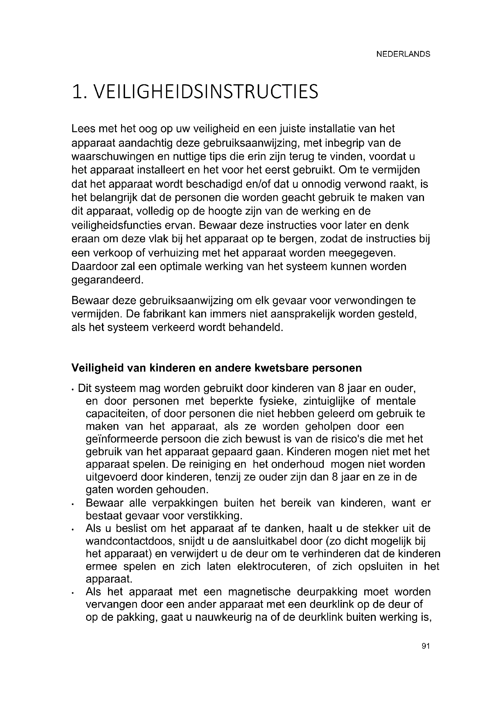 Lees met het oog op uw veiligheid en een juiste installatie van het apparaat aandachtig deze gebruiksaanwijzing, met inbegrip van de waarschuwingen en nuttige tips die erin zijn terug te vinden, voordat u het apparaat installeert en het voor het eerst gebruikt. Om te vermijden dat het apparaat wordt beschadigd en/of dat u onnodig verwond raakt, is het belangrijk dat de personen die worden geacht gebruik te maken van dit apparaat, volledig op de hoogte zijn van de werking en de veiligheidsfuncties ervan. Bewaar deze instructies voor later en denk eraan om deze vlak bij het apparaat op te bergen, zodat de instructies bij een verkoop of verhuizing met het apparaat worden meegegeven. Daardoor zal een optimale werking van het systeem kunnen worden gegarandeerd. Bewaar deze gebruiksaanwijzing om elk gevaar voor verwondingen te vermijden. De fabrikant kan immers niet aansprakelijk worden gesteld, als het systeem verkeerd wordt behandeld. Veiligheid van kinderen en andere kwetsbare personen