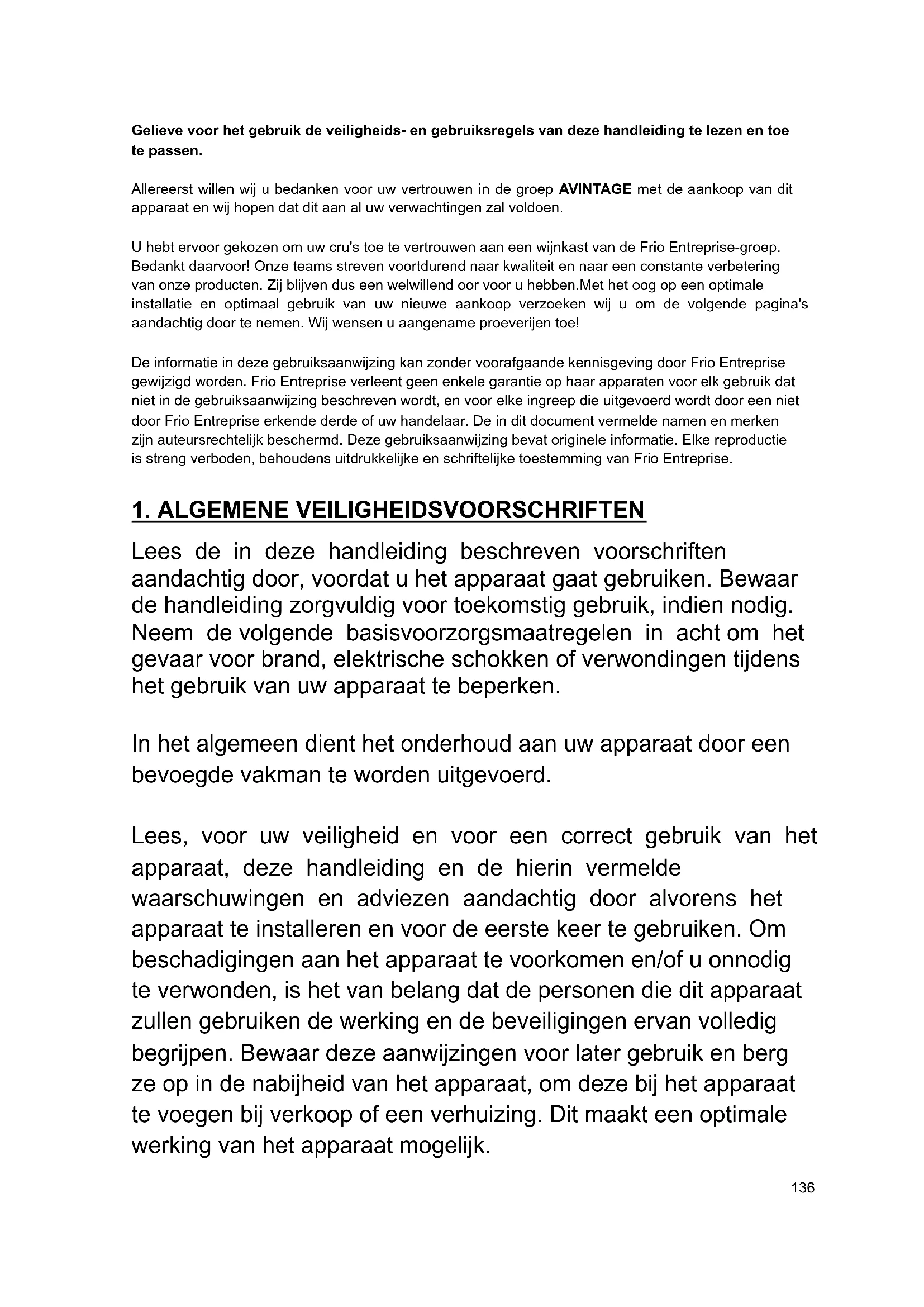 Sollten die Parameter nach einstündigem Betrieb nicht wieder normal sein, wird der akustische Alarm erneut eingeschaltet. In diesem Fall wird empfohlen, den Netzstecker des Geräts aus der Steckdose zu ziehen und den Kundendienst zu kontaktieren. Aber was auch passiert, bewahren Sie die Ruhe, wenn Sie eine Anomalie der Temperatur bzw. Luftfeuchtigkeit im Inneren des Weinschranks feststellen. Anormale Bedingungen können dem Wein nur schaden, wenn er ihnen dauerhaft ausgesetzt ist.136 Gelieve voor het gebruik de veiligheids- en gebruiksregels van deze handleiding te lezen en toe te passen. Allereerst willen wij u bedanken voor uw vertrouwen in de groep AVINTAGE met de aankoop van dit apparaat en wij hopen dat dit aan al uw verwachtingen zal voldoen. U hebt ervoor gekozen om uw cru's toe te vertrouwen aan een wijnkast van de Frio Entreprise-groep. Bedankt daarvoor! Onze teams streven voortdurend naar kwaliteit en naar een constante verbetering van onze producten. Zij blijven dus een welwillend oor voor u hebben.Met het oog op een optimale installatie en optimaal gebruik van uw nieuwe aankoop verzoeken wij u om de volgende pagina's aandachtig door te nemen. Wij wensen u aangename proeverijen toe! De informatie in deze gebruiksaanwijzing kan zonder voorafgaande kennisgeving door Frio Entreprise gewijzigd worden. Frio Entreprise verleent geen enkele garantie op haar apparaten voor elk gebruik dat niet in de gebruiksaanwijzing beschreven wordt, en voor elke ingreep die uitgevoerd wordt door een niet door Frio Entreprise erkende derde of uw handelaar. De in dit document vermelde namen en merken zijn auteursrechtelijk beschermd. Deze gebruiksaanwijzing bevat originele informatie. Elke reproductie is streng verboden, behoudens uitdrukkelijke en schriftelijke toestemming van Frio Entreprise.