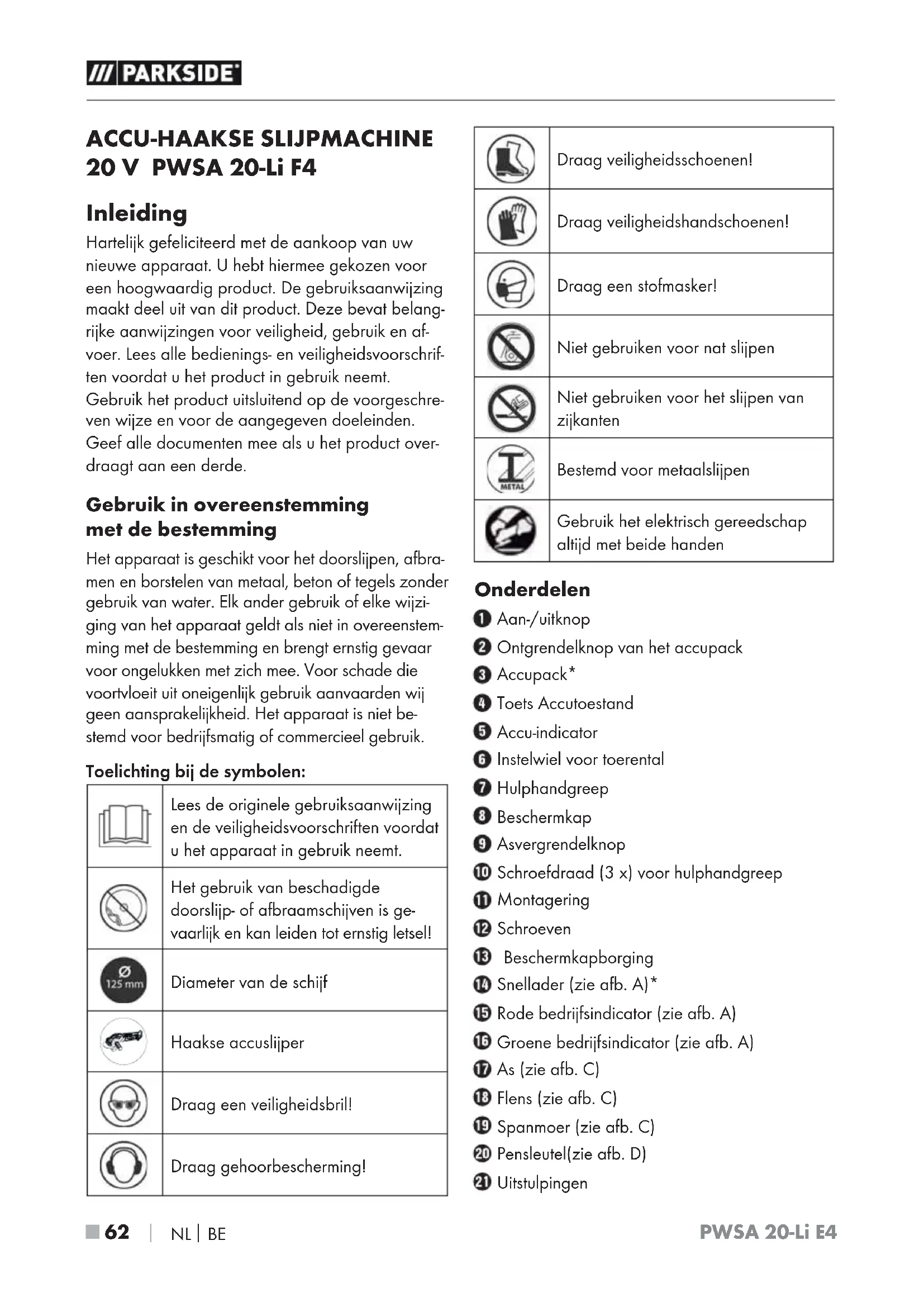 ACCU-HAAKSE SLIJPMACHINE 20 V PWSA 20-Li F4 Inleiding Hartelijk gefeliciteerd met de aankoop van uw nieuwe apparaat. U hebt hiermee gekozen voor een hoogwaardig product. De gebruiksaanwijzing maakt deel uit van dit product. Deze bevat belang- rijke aanwijzingen voor veiligheid, gebruik en af- voer. Lees alle bedienings- en veiligheidsvoorschrif- ten voordat u het product in gebruik neemt. Gebruik het product uitsluitend op de voorgeschre- ven wijze en voor de aangegeven doeleinden. Geef alle documenten mee als u het product over- draagt aan een derde. Gebruik in overeenstemming metdebestemming Het apparaat is geschikt voor het doorslijpen, afbra- men en borstelen van metaal, beton of tegels zonder gebruik van water. Elk ander gebruik of elke wijzi- ging van het apparaat geldt als niet in overeenstem- ming met de bestemming en brengt ernstig gevaar voor ongelukken met zich mee. Voor schade die voortvloeit uit oneigenlijk gebruik aanvaarden wij geen aansprakelijkheid. Het apparaat is niet be- stemd voor bedrijfsmatig of commercieel gebruik. Toelichting bij de symbolen: Lees de originele gebruiksaanwijzing en de veiligheidsvoorschriften voordat u het apparaat in gebruik neemt. Het gebruik van beschadigde doorslijp- of afbraamschijven is ge- vaarlijk en kan leiden tot ernstig letsel! Diameter van de schijf Haakse accuslijper Draag een veiligheidsbril! Draag gehoorbescherming! Draag veiligheidsschoenen! Draag veiligheidshandschoenen! Draag een stofmasker! Niet gebruiken voor nat slijpen Niet gebruiken voor het slijpen van zijkanten Bestemd voor metaalslijpen Gebruik het elektrisch gereedschap altijd met beide handen Onderdelen Aan-/uitknop Ontgrendelknop van het accupack Accupack* Toets Accutoestand Accu-indicator Instelwiel voor toerental Hulphandgreep Beschermkap Asvergrendelknop Schroefdraad (3 x) voor hulphandgreep Montagering Schroeven Beschermkapborging Snellader (zie afb. A)* Rode bedrijfsindicator (zie afb. A) Groene bedrijfsindicator (zie afb. A) As (zie afb. C) Flens (zie afb. C) Spanmoer (zie afb. C) Pensleutel(zie afb. D) UitstulpingenPWSA 20-Li E4