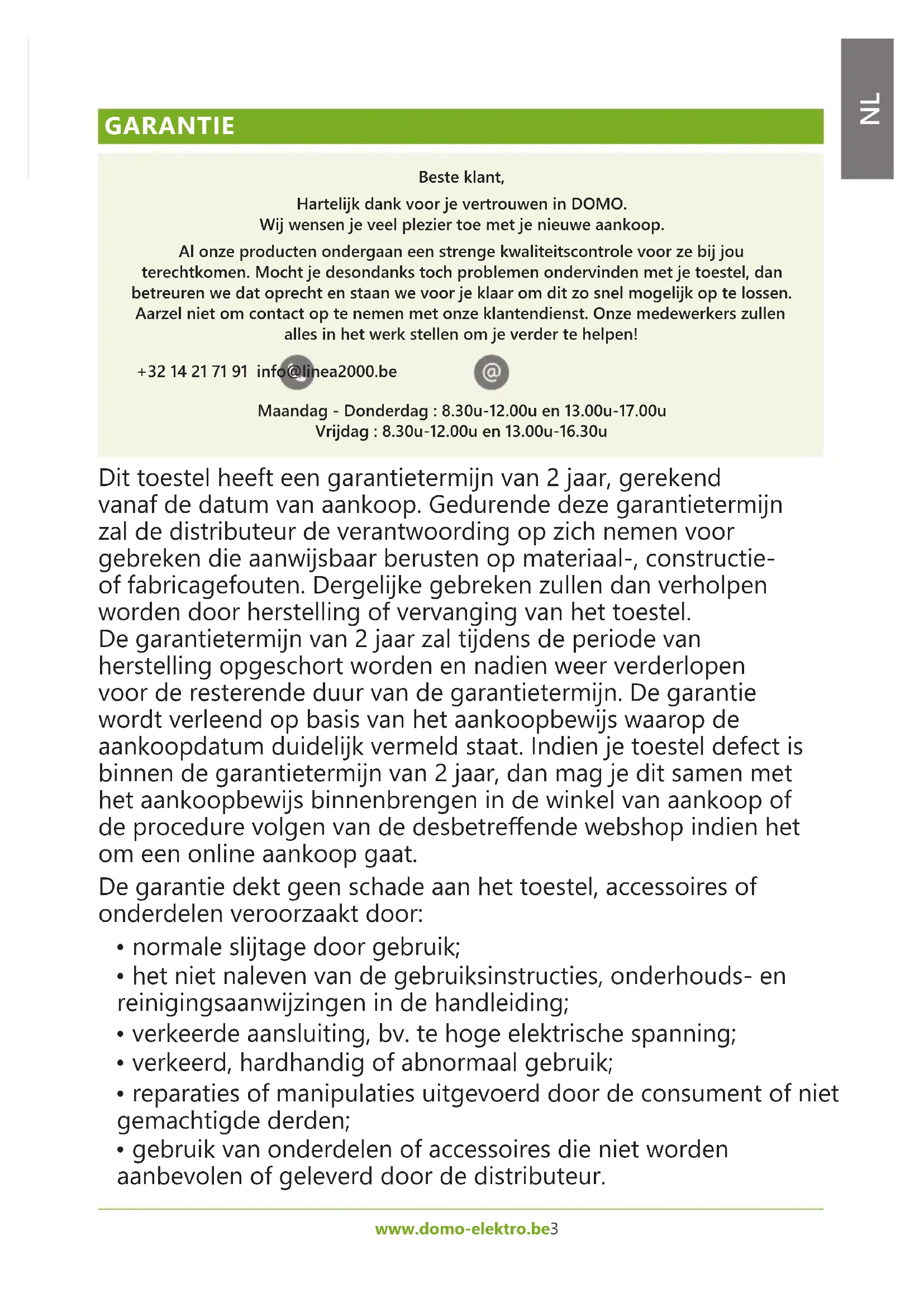 GARANTIE Beste klant, Hartelijk dank voor je vertrouwen in DOMO. Wij wensen je veel plezier toe met je nieuwe aankoop. Al onze producten ondergaan een strenge kwaliteitscontrole voor ze bij jou terechtkomen. Mocht je desondanks toch problemen ondervinden met je toestel, dan betreuren we dat oprecht en staan we voor je klaar om dit zo snel mogelijk op te lossen. Aarzel niet om contact op te nemen met onze klantendienst. Onze medewerkers zullen alles in het werk stellen om je verder te helpen! +32 14 21 71 91 info@linea2000.be Maandag - Donderdag : 8.30u-12.00u en 13.00u-17.00u Vrijdag : 8.30u-12.00u en 13.00u-16.30u Dit toestel heeft een garantietermijn van 2 jaar, gerekend vanaf de datum van aankoop. Gedurende deze garantietermijn zal de distributeur de verantwoording op zich nemen voor gebreken die aanwijsbaar berusten op materiaal-, constructie- of fabricagefouten. Dergelijke gebreken zullen dan verholpen worden door herstelling of vervanging van het toestel. De garantietermijn van 2 jaar zal tijdens de periode van herstelling opgeschort worden en nadien weer verderlopen voor de resterende duur van de garantietermijn. De garantie wordt verleend op basis van het aankoopbewijs waarop de aankoopdatum duidelijk vermeld staat. Indien je toestel defect is binnen de garantietermijn van 2 jaar, dan mag je dit samen met het aankoopbewijs binnenbrengen in de winkel van aankoop of de procedure volgen van de desbetreende webshop indien het om een online aankoop gaat. De garantie dekt geen schade aan het toestel, accessoires of onderdelen veroorzaakt door: