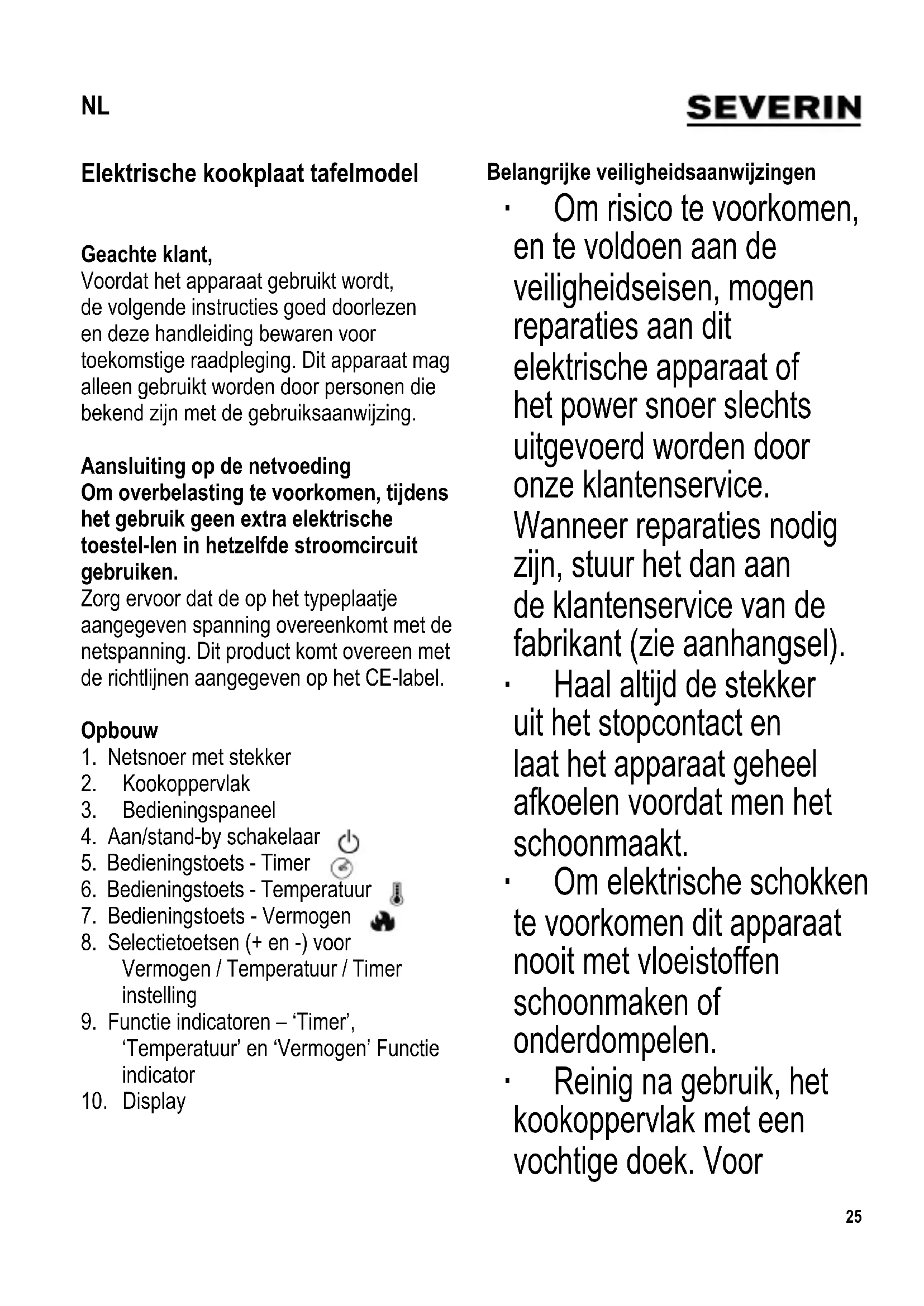 Belangrijke veiligheidsaanwijzingen ∙ Om risico te voorkomen, en te voldoen aan de veiligheidseisen, mogen reparaties aan dit elektrische apparaat of het power snoer slechts uitgevoerd worden door onze klantenservice. Wanneer reparaties nodig zijn, stuur het dan aan de klantenservice van de fabrikant (zie aanhangsel). ∙ Haal altijd de stekker uit het stopcontact en laat het apparaat geheel afkoelen voordat men het schoonmaakt. ∙ Om elektrische schokken te voorkomen dit apparaat nooit met vloeistoffen schoonmaken of onderdompelen. ∙ Reinig na gebruik, het kookoppervlak met een vochtige doek. Voor NL26 104 x 142 mm uitvoerige informatie over het schoonmaken van het apparaat, raadpleeg de sectie Onderhoud en schoonmaken. ∙ Voorzichtig: Om gevaar voor een elektrische schok te voorkomen moet het toestel uitgeschakeld en losgekoppeld worden van het elektriciteitsnet als het oppervlak barsten of soortgelijke beschadigingen vertoond. ∙ Dit apparaat is niet geschikt voor gebruik met een externe tijdklok of een apart afstandsbediening. ∙ Plaats geen metalen voorwerpen (bijv. messen, vorken of lepels) op het kookoppervlak omdat dergelijke voorwerpen heet kunnen worden. ∙ Dit apparaat is bestemd voor huishoudelijk of gelijkwaardig gebruik, zoals - in bedrijfskeukens, in winkels, kantoren of andere bedrijfsruimtes, - in agrarische instellingen, - door klanten in hotels, motels enz. en gelijkwaardige accommodaties, - in bed and breakfast gasthuizen. ∙ Dit apparaat mag gebruikt worden door kinderen (tenminste 8 jaar oud) welke onder begeleiding zijn of die instructies over het gebruik van het apparaat ontvangen hebben en de gevaren en veiligheidsvoorschriften volledig begrijpen. ∙ Kinderen mogen niet met het apparaat spelen. ∙ Kinderen mogen in geen geval dit apparaat schoonmaken of104 x 142 mm