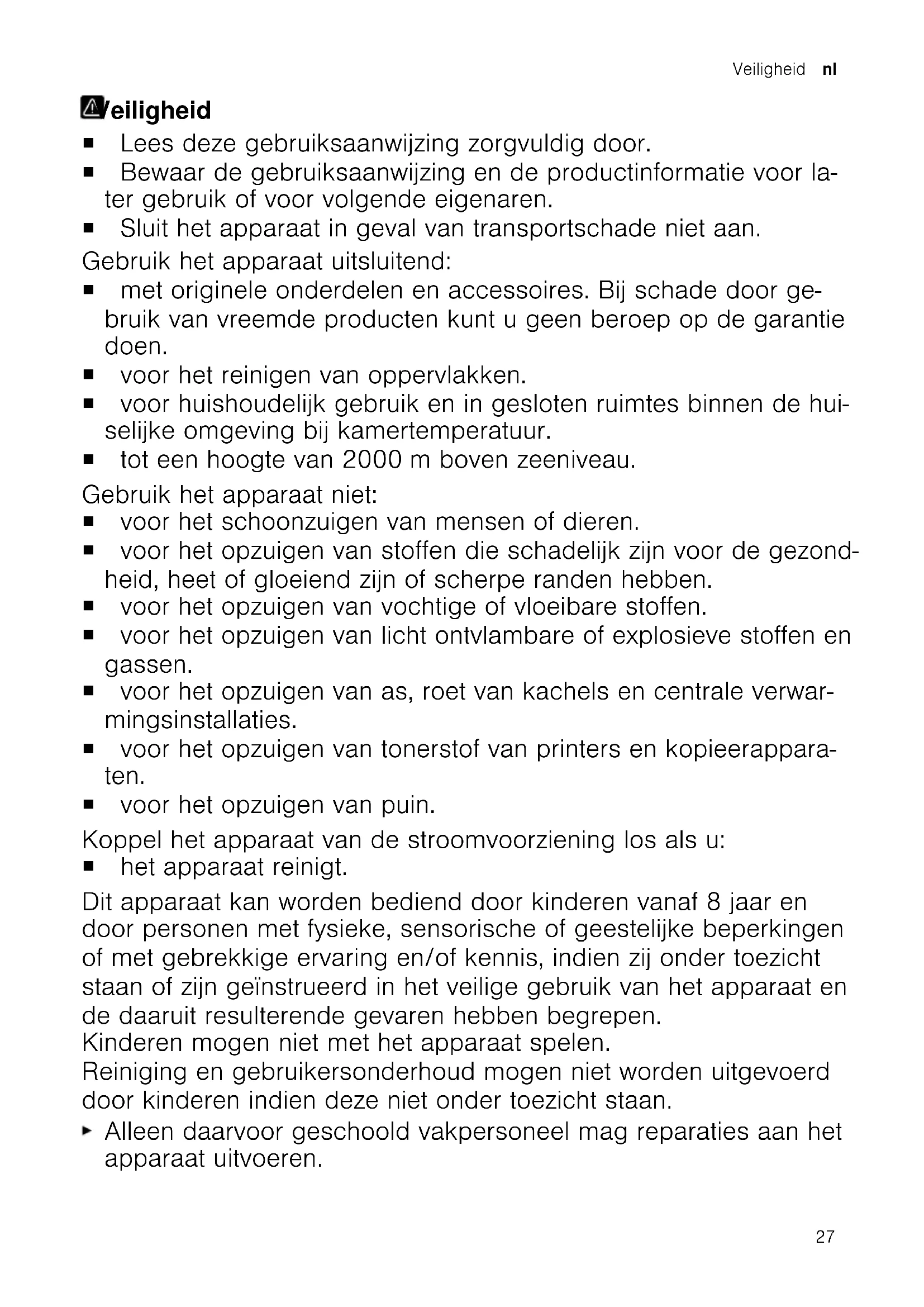 Pulire il filtro del contenitore raccoglipolvere. Il filtro d'igiene è sporco. Pulire il filtro d'igiene. La spazzola della boc- chetta Turbo non ruota. Il rullo spazzola è sporco. Pulire il rullo spazzola. La potenza di aspirazione è insufficiente. Ruotare il regolatore alla massima potenza di aspirazione. Rottamazione di un apparecchio dismessoRottamazione di un apparec- chio dismesso Smaltire l'apparecchio nel rispetto dell'ambiente. Per informazioni sulle attuali procedure di smaltimento rivolgersi al rivenditore specializzato o al comune di competen- za. Questo apparecchio dispone di contrassegno ai sensi della direttiva europea 2012/19/UE in materia di apparecchi elet- trici ed elettronici (waste elec- trical and electronic equip- ment - WEEE). Questa direttiva definisce le norme per la raccolta e il rici- claggio degli apparecchi di- smessi valide su tutto il territo- rio dell’Unione Europea. Servizio di assistenza clientiServizio di assistenza clienti Informazioni dettagliate sulla durata e sulle condizioni di garanzia in ciascun Paese so- no reperibili tramite il codice QR sul docu- mento allegato relativo ai contatti di assi- stenza e alle condizioni di garanzia, presso il nostro servizio di assistenza clienti, il vo- stro rivenditore o sul nostro sito web. I dati di contatto del servizio di assistenza clienti sono reperibili tramite il codice QR sul documento allegato relativo ai contatti di assistenza e alle condizioni di garanzia o sul nostro sito web. Le informazioni conformi alla normativa (EU) 2023/826 sono disponibili online alla voce www.bosch-home.com nella pagina del prodotto e nella pagina di assistenza dell'apparecchio nelle istruzioni per l'uso e nei documenti aggiuntivi. 26Veiligheid nl Veiligheid Veiligheid ¡ Lees deze gebruiksaanwijzing zorgvuldig door. ¡ Bewaar de gebruiksaanwijzing en de productinformatie voor la- ter gebruik of voor volgende eigenaren. ¡ Sluit het apparaat in geval van transportschade niet aan. Gebruik het apparaat uitsluitend: ¡ met originele onderdelen en accessoires. Bij schade door ge- bruik van vreemde producten kunt u geen beroep op de garantie doen. ¡ voor het reinigen van oppervlakken. ¡ voor huishoudelijk gebruik en in gesloten ruimtes binnen de hui- selijke omgeving bij kamertemperatuur. ¡ tot een hoogte van 2000m boven zeeniveau. Gebruik het apparaat niet: ¡ voor het schoonzuigen van mensen of dieren. ¡ voor het opzuigen van stoffen die schadelijk zijn voor de gezond- heid, heet of gloeiend zijn of scherpe randen hebben. ¡ voor het opzuigen van vochtige of vloeibare stoffen. ¡ voor het opzuigen van licht ontvlambare of explosieve stoffen en gassen. ¡ voor het opzuigen van as, roet van kachels en centrale verwar- mingsinstallaties. ¡ voor het opzuigen van tonerstof van printers en kopieerappara- ten. ¡ voor het opzuigen van puin. Koppel het apparaat van de stroomvoorziening los als u: ¡ het apparaat reinigt. Dit apparaat kan worden bediend door kinderen vanaf 8 jaar en door personen met fysieke, sensorische of geestelijke beperkingen of met gebrekkige ervaring en/of kennis, indien zij onder toezicht staan of zijn geïnstrueerd in het veilige gebruik van het apparaat en de daaruit resulterende gevaren hebben begrepen. Kinderen mogen niet met het apparaat spelen. Reiniging en gebruikersonderhoud mogen niet worden uitgevoerd door kinderen indien deze niet onder toezicht staan. Alleen daarvoor geschoold vakpersoneel mag reparaties aan het apparaat uitvoeren. 27nl Veiligheid Er mogen uitsluitend originele reserveonderdelen worden ge- bruikt voor reparatie van het apparaat. Als het netsnoer van dit apparaat beschadigd raakt, moet het ter vermijding van risico's worden vervangen door de fabrikant, de servicedienst of een andere gekwalificeerde persoon. Nooit een beschadigd apparaat gebruiken. Nooit een apparaat met gescheurd of gebroken oppervlak ge- bruiken. Nooit aan het netsnoer trekken, om het apparaat van het elektri- citeitsnet te scheiden. Altijd aan de stekker van het netsnoer trek- ken. Nooit het apparaat aan het netsnoer trekken of dragen. Wanneer het apparaat of het netsnoer is beschadigd, dan direct de stekker van het netsnoer uit het stopcontact halen of de zeke- ring in de meterkast uitschakelen. Contact opnemen met de servicedienst.