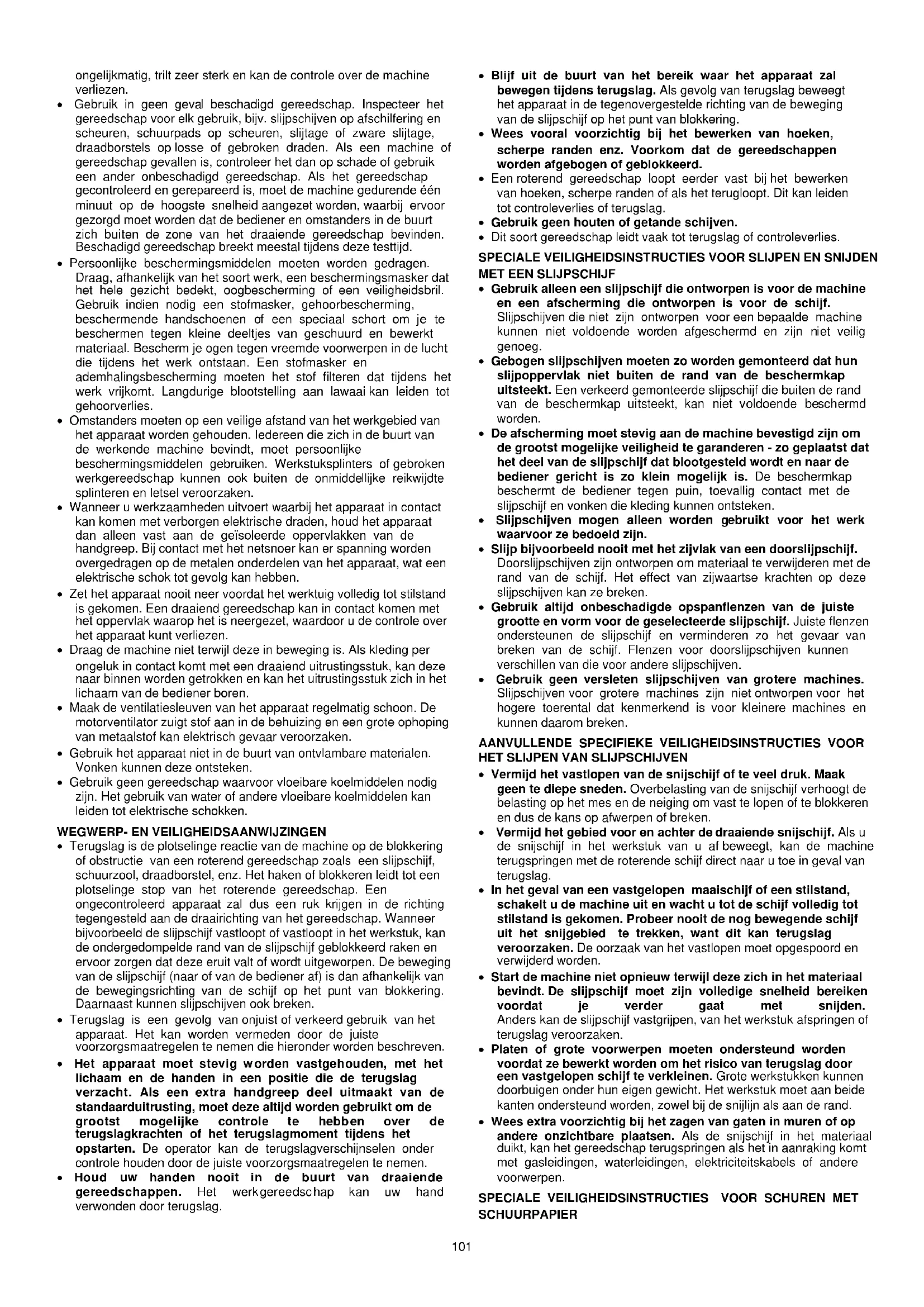 - Schuurgereedschap moet voor gebruik worden gecontroleerd. Het schuurgereedschap moet correct gemonteerd zijn en vrij kunnen draaien. Laat de machine als onderdeel van de test minstens één minuut onbelast draaien in een veilige positie. Gebruik geen beschadigd of trillend schuurgereedschap. Schuurgereedschap moet rond van vorm zijn. Beschadigd schuurgereedschap kan breken en letsel veroorzaken.