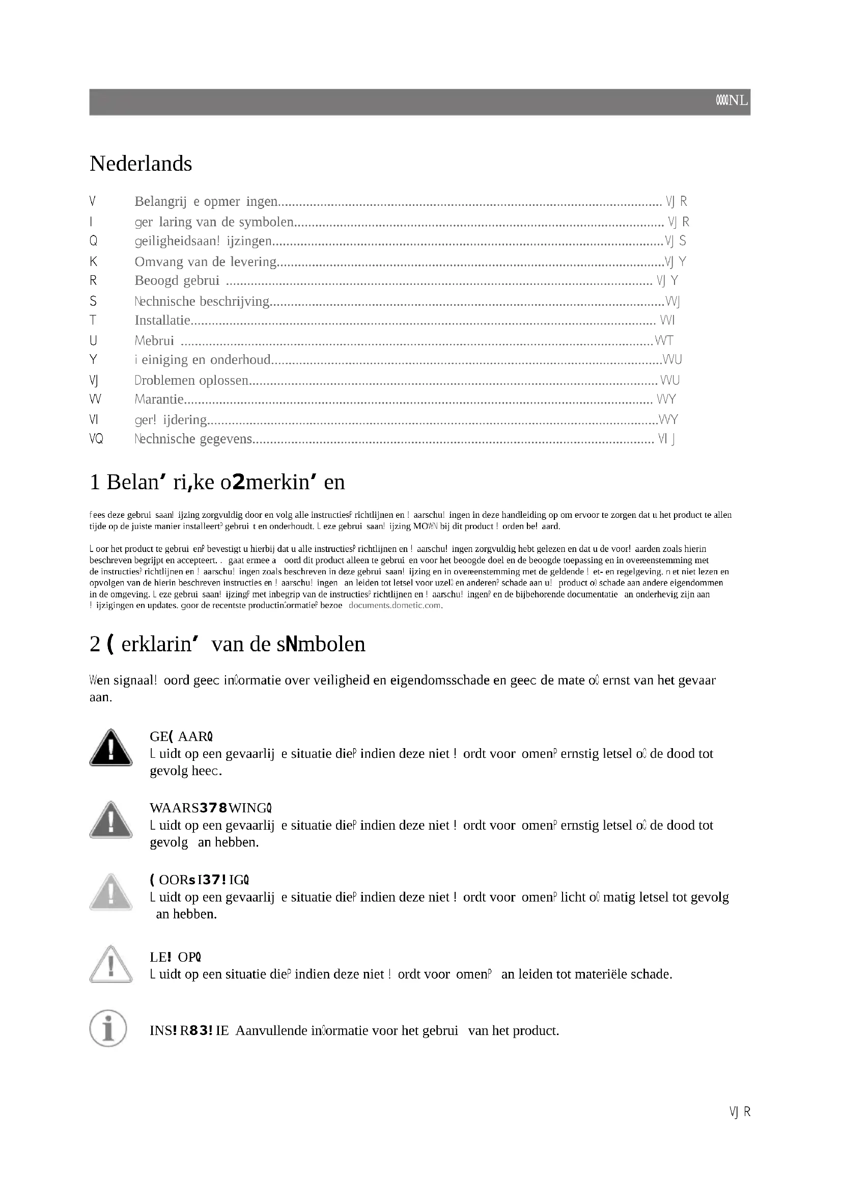 - 13 Technische gegevens 1 Belangrijke opmerkingen Lees deze gebruiksaanwijzing zorgvuldig door en volg alle instructies, richtlijnen en waarschuwingen in deze handleiding op om ervoor te zorgen dat u het product te allen tijde op de juiste manier installeert, gebruikt en onderhoudt. Deze gebruiksaanwijzing MOET bij dit product worden bewaard. Door het product te gebruiken, bevestigt u hierbij dat u alle instructies, richtlijnen en waarschuwingen zorgvuldig hebt gelezen en dat u de voorwaarden zoals hierin beschreven begrijpt en accepteert. U gaat ermee akkoord dit product alleen te gebruiken voor het beoogde doel en de beoogde toepassing en in overeenstemming met de instructies, richtlijnen en waarschuwingen zoals beschreven in deze gebruiksaanwijzing en in overeenstemming met de geldende wet- en regelgeving. Het niet lezen en opvolgen van de hierin beschreven instructies en waarschuwingen kan leiden tot letsel voor uzelf en anderen, schade aan uw product of schade aan andere eigendommen in de omgeving. Deze gebruiksaanwijzing, met inbegrip van de instructies, richtlijnen en waarschuwingen, en de bijbehorende documentatie kan onderhevig zijn aan wijzigingen en updates. Voor de recentste productinformatie, bezoek documents.dometic.com. 2 Verklaring van de symbolen Een signaalwoord gee informatie over veiligheid en eigendomsschade en gee de mate of ernst van het gevaar aan. GEVAAR! Duidt op een gevaarlijke situatie die, indien deze niet wordt voorkomen, ernstig letsel of de dood tot gevolg hee. WAARSCHUWING! Duidt op een gevaarlijke situatie die, indien deze niet wordt voorkomen, ernstig letsel of de dood tot gevolg kan hebben. VOORZICHTIG! Duidt op een gevaarlijke situatie die, indien deze niet wordt voorkomen, licht of matig letsel tot gevolg kan hebben. LET OP! Duidt op een situatie die, indien deze niet wordt voorkomen, kan leiden tot materiële schade. INSTRUCTIE Aanvullende informatie voor het gebruik van het product. 105NL 3 Veiligheidsaanwijzingen Neem ook de veiligheidsaanwijzingen en voorschriften van de voertuigfabrikant en erkende werkplaatsen in acht. p. 120