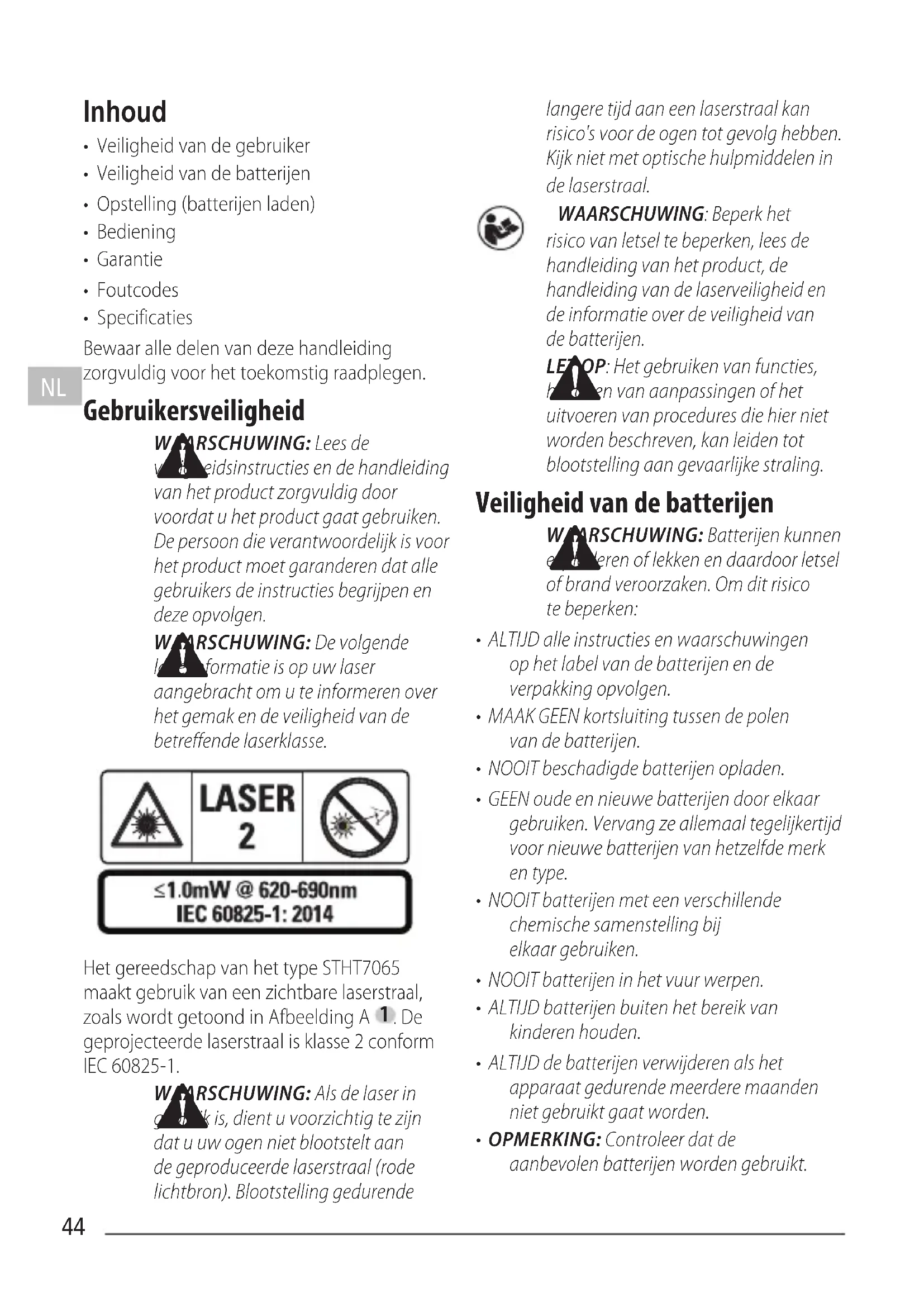 Het gereedschap van het type STHT7065 maakt gebruik van een zichtbare laserstraal, zoals wordt getoond in AfbeeldingA . De geprojecteerde laserstraal is klasse 2conform IEC 60825-1. WAARSCHUWING: Als de laser in gebruik is, dient u voorzichtig te zijn dat u uw ogen niet blootstelt aan de geproduceerde laserstraal (rode lichtbron). Blootstelling gedurende langere tijd aan een laserstraal kan risico's voor de ogen tot gevolg hebben. Kijk niet met optische hulpmiddelen in delaserstraal. WAARSCHUWING: Beperk het risico van letsel te beperken, lees de handleiding van het product, de handleiding van de laserveiligheid en de informatie over de veiligheid van debatterijen. LET OP: Het gebruiken van functies, het doen van aanpassingen of het uitvoeren van procedures die hier niet worden beschreven, kan leiden tot blootstelling aan gevaarlijkestraling. Veiligheid van de batterijen