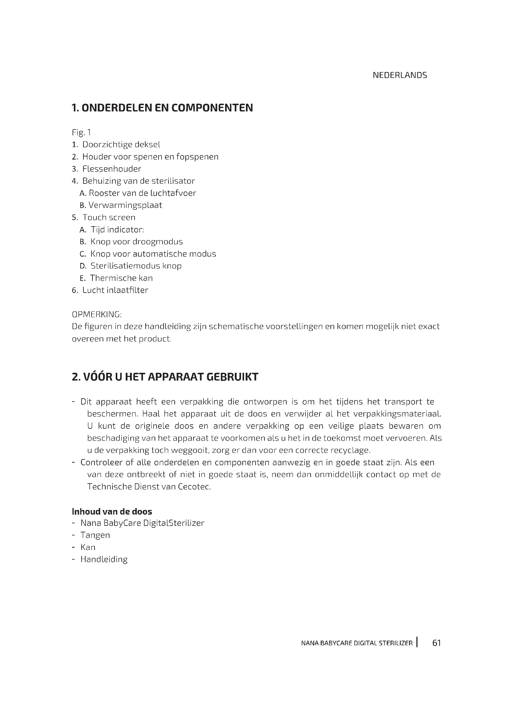 - Dit apparaat heeft een verpakking die ontworpen is om het tijdens het transport te beschermen. Haal het apparaat uit de doos en verwijder al het verpakkingsmateriaal. U kunt de originele doos en andere verpakking op een veilige plaats bewaren om beschadiging van het apparaat te voorkomen als u het in de toekomst moet vervoeren. Als u de verpakking toch weggooit, zorg er dan voor een correcte recyclage. - Controleer of alle onderdelen en componenten aanwezig en in goede staat zijn. Als een van deze ontbreekt of niet in goede staat is, neem dan onmiddellijk contact op met de Technische Dienst van Cecotec. Inhoud van de doos - Nana BabyCare DigitalSterilizer - Tangen - Kan - HandleidingNANA BABYCARE DIGITAL STERILIZER