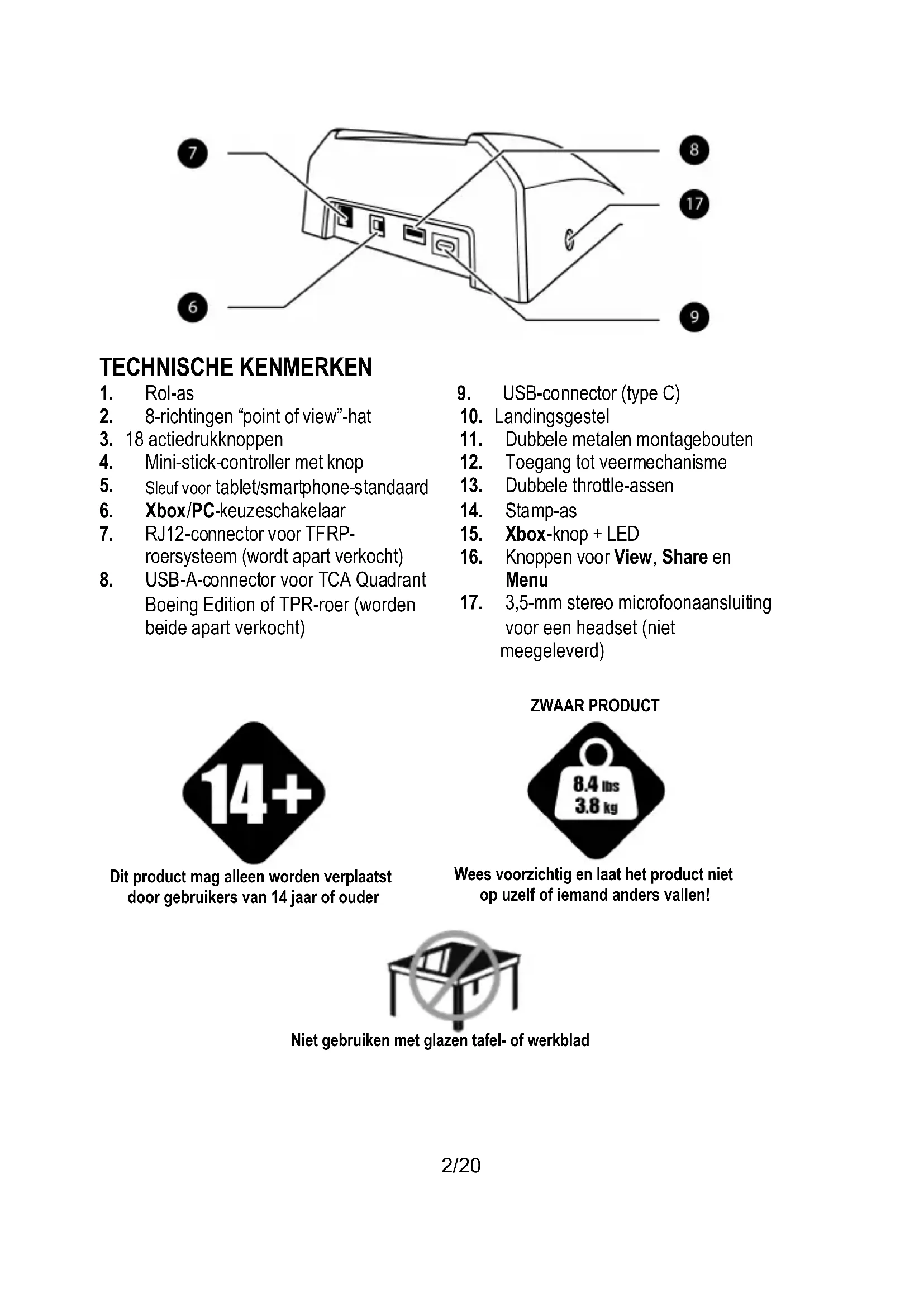 Een lijst van games voor de Xbox Series X|S / Xbox One die compatibel zijn met de yoke is beschikbaar op https://support.thrustmaster.com in de sectie Joysticks / TCA Yoke Boeing Edition. Deze lijst wordt regelmatig bijgewerkt met nieuw uitgebrachte Xbox Series X|S / Xbox One- games compatibel met de TCA Yoke Boeing Edition.4/20 DE TCA YOKE BOEING EDITION LEREN KENNEN EXCLUSIEVE PRECISIETECHNOLOGIE H.E.A.R.T: HALLEFFECT ACCURATE TECHNOLOGY EN PENDUL_R De TCA Yoke Boeing Edition is uitgerust met technieken die voor een ongeëvenaarde nauwkeurigheid zorgen in de wereld van de joysticks/gaming-yokes, zoals: - 3D (Hall-effect) magnetische sensoren op de rol- en stamp-assen, met een nauwkeurigheid van 16 bits (65.536 x 65.536 waarden); - een magneet die zorgt voor geen wrijving en uitmuntende nauwkeurigheid die nooit zal slijten; - stevige, lineaire en super vloeiende spanning die door verwijderbare veren op de stamp- as kan worden aangepast (raadpleeg de sectie PROCEDURE VOOR HET AANPASSEN VAN DE SPANNING OP DE STAMP-AS op pagina 13 voor meer informatie). THROTTLE De yoke beschikt over twee throttle-assen (13) te gebruiken om gemakkelijk de stuwkracht van de motor te bedienen. MICROFOON-JACK VOOR HEADSET (NIET MEEGELEVERD) De yoke heeft een 3,5 mm vrouwtjes microfoon-jack (17) waarop een headset met een microfoon kan worden aangesloten voor de meest onderdompelende ervaring.