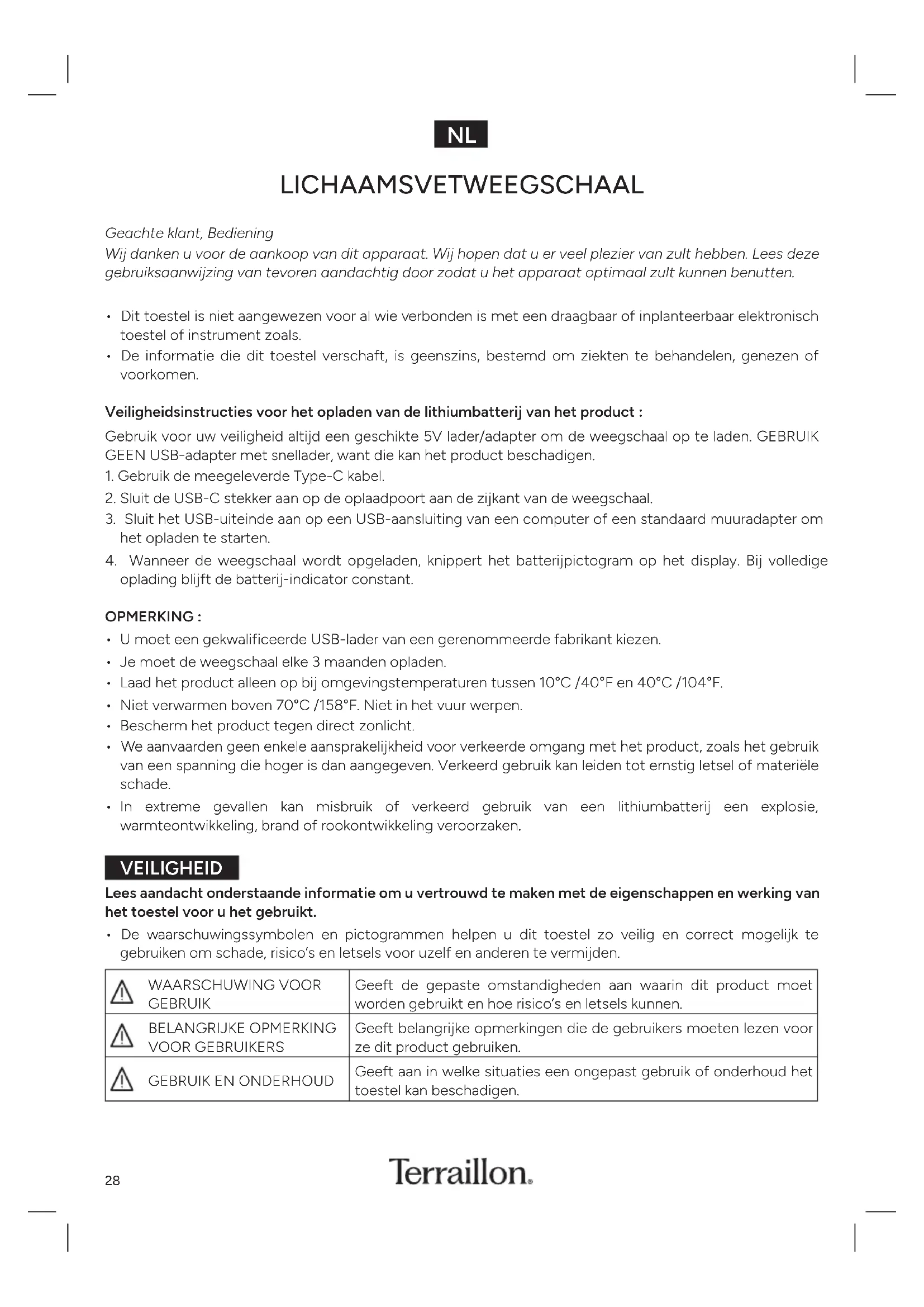 - De informatie die dit toestel verschaft, is geenszins, bestemd om ziekten te behandelen, genezen of voorkomen Veiligheidsinstructies voor het opladen van de lithiumbatterij van het product : Gebruik voor uw veiligheid altijd een geschikte 5V lader/adapter om de weegschaal op te laden GEBRUIK GEEN USB-adapter met snellader, want die kan het product beschadigen 1 Gebruik de meegeleverde Type-C kabel 2 Sluit de USB-C stekker aan op de oplaadpoort aan de zijkant van de weegschaal 3 Sluit het USB-uiteinde aan op een USB-aansluiting van een computer of een standaard muuradapter om het opladen te starten 4 Wanneer de weegschaal wordt opgeladen, knippert het batterijpictogram op het display Bij volledige oplading blijft de batterij-indicator constant OPMERKING :