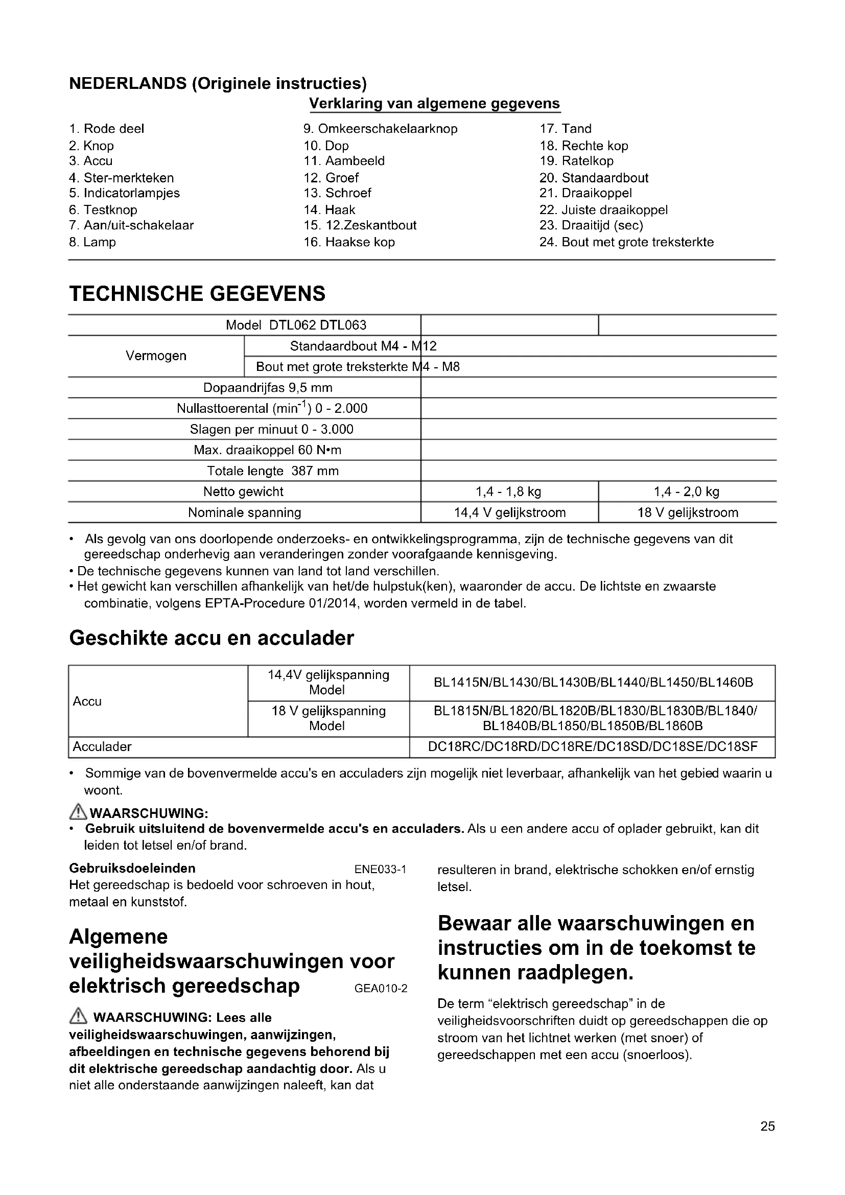 - Gebruik uitsluitend de bovenvermelde accu's en acculaders. Als u een andere accu of oplader gebruikt, kan dit leiden tot letsel en/of brand. Gebruiksdoeleinden ENE033-1 Het gereedschap is bedoeld voor schroeven in hout, metaal en kunststof. Algemene veiligheidswaarschuwingen voor elektrisch gereedschap GEA010-2 WAARSCHUWING: Lees alle veiligheidswaarschuwingen, aanwijzingen, afbeeldingen en technische gegevens behorend bij dit elektrische gereedschap aandachtig door. Als u niet alle onderstaande aanwijzingen naleeft, kan dat resulteren in brand, elektrische schokken en/of ernstig letsel. Bewaar alle waarschuwingen en instructies om in de toekomst te kunnen raadplegen. De term “elektrisch gereedschap” in de veiligheidsvoorschriften duidt op gereedschappen die op stroom van het lichtnet werken (met snoer) of gereedschappen met een accu (snoerloos).