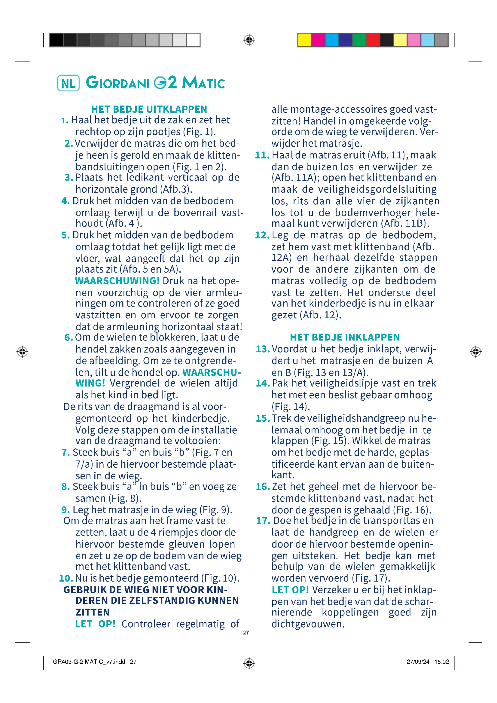 GR403-G-2 MATIC_v7.indd 27GR403-G-2 MATIC_v7.indd 27 27/09/24 15:0227/09/24 15:02VEILIGHEID Voordat u uw kind in het bedje legt, ver- zekert u zich er opnieuw van dat de 4 scharnierende koppelingen en de kop- peling op de basis goed zijn vergrendeld. LET OP! Het bedje is pas klaar voor ge- bruik als de sluitingsmechanismen van het scharniersysteem zijn vergrendeld. Kijk uit dat u niets in het bedje laat liggen waardoor het kind eruit kan klimmen, of wat verstikking of wurging kan veroor- zaken. Houd het bedje uit de buurt van vuur en andere warmtebronnen, zoals elektrische radiatoren en fornuizen. ONDERHOUD Stel het product niet gedurende lan- gere tijd bloot aan de zon of aan weer en wind, om kleurveranderingen van de stof en materialen te voorkomen. Reinig de hoes met een doekje en een fijn was- middel. LET OP! De stof van het bedje kan niet verwijderd worden! Reinig de plastic en metalen delen met een voch- tige doek. Droog ze vervolgens goed af. Houd de wielen vrij van zand en stof. Transporttas: met de hand met koud water en een neutraal wasmiddel was- sen en nat ophangen. SAMENSTELLING Bekleding: 100% Polyester Frame: Staal Polypropyleen AFMETINGEN Uitgeklapt: Br: 125 cm; H: 66 cm; D: 74 cm. Ingeklapt: Br: 21 cm; H: 74 cm; D: 20 cm. WAARSCHUWINGEN