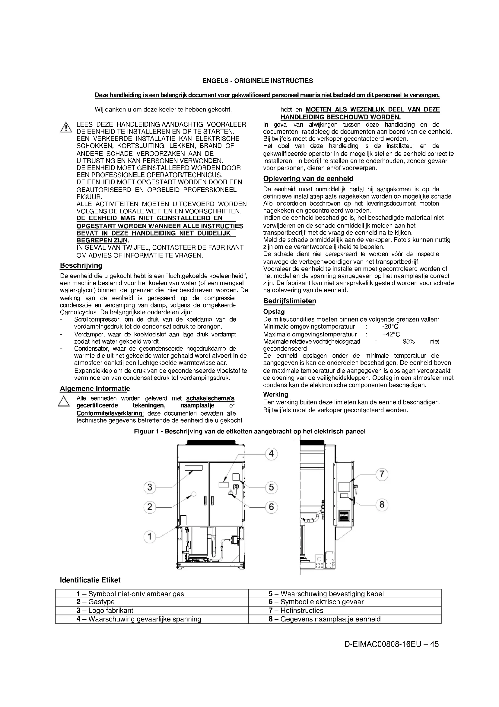 Figuur 1 - Beschrijving van de etiketten aangebracht op het elektrisch paneel Identificatie Etiket 1 – Symbool niet-ontvlambaar gas 5 – Waarschuwing bevestiging kabel 2 – Gastype 6 – Symbool elektrisch gevaar 3 – Logo fabrikant 7 – Hefinstructies 4 – Waarschuwing gevaarlijke spanning 8 – Gegevens naamplaatje eenheidD-EIMAC00808-16EU – 46