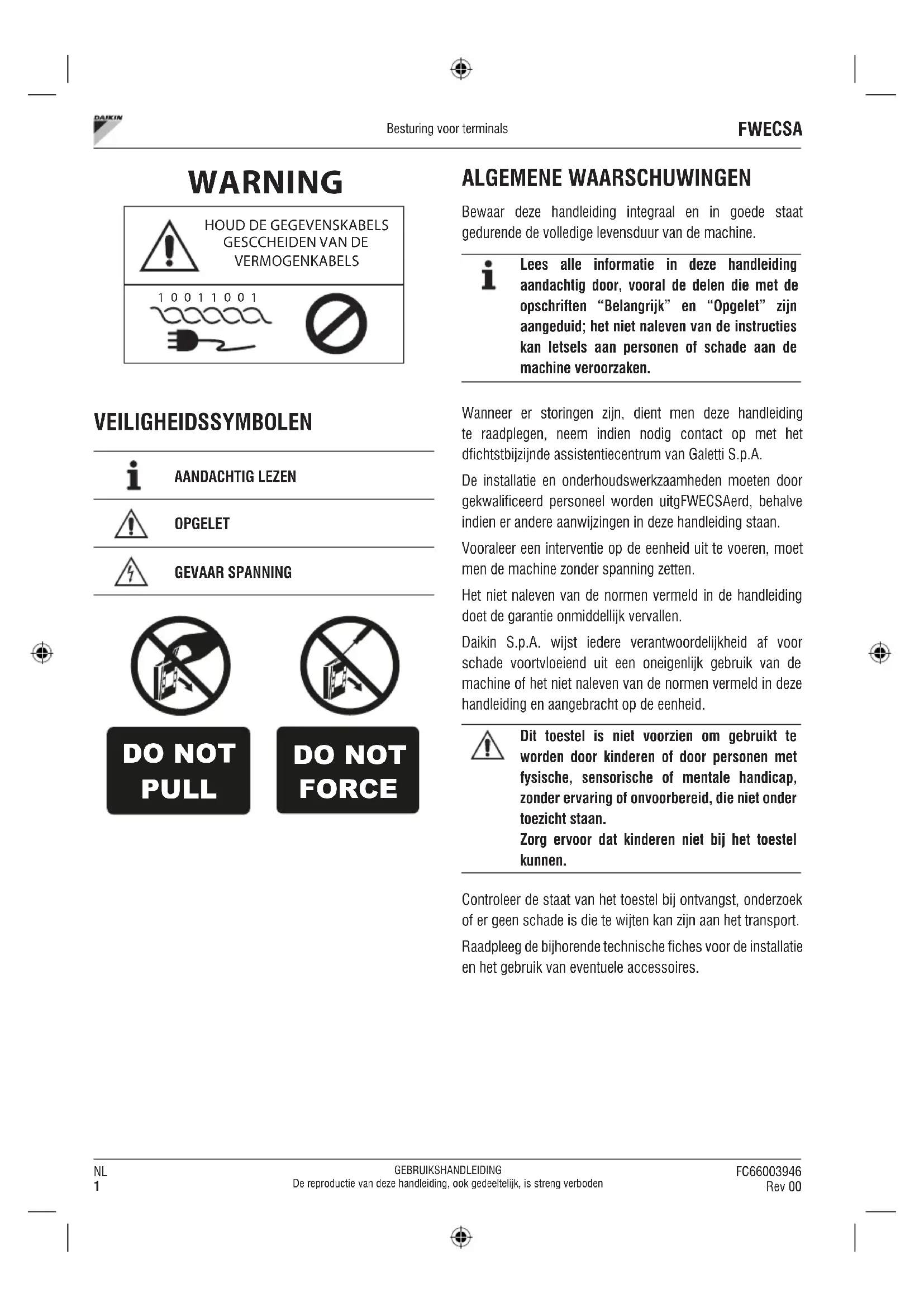 DO NOT PULL DO NOT FORCE ALGEMENE WAARSCHUWINGEN Bewaar deze handleiding integraal en in goede staat gedurende de volledige levensduur van de machine.Lees alle informatie in deze handleiding aandachtig door, vooral de delen die met de opschriften “Belangrijk” en “Opgelet” zijn aangeduid; het niet naleven van de instructies kan letsels aan personen of schade aan de machine veroorzakenWanneer er storingen zijn, dient men deze handleiding te raadplegen, neem indien nodig contact op met het dfichtstbijzijnde assistentiecentrum van Galetti S.p.A.De installatie en onderhoudswerkzaamheden moeten door gekwalificeerd personeel worden uitgFWECSAerd, behalve indien er andere aanwijzingen in deze handleiding staan.Vooraleer een interventie op de eenheid uit te voeren, moet men de machine zonder spanning zetten.Het niet naleven van de normen vermeld in de handleiding doet de garantie onmiddellijk vervallen.Daikin S.p.A. wijst iedere verantwoordelijkheid af voor schade voortvloeiend uit een oneigenlijk gebruik van de machine of het niet naleven van de normen vermeld in deze handleiding en aangebracht op de eenheid.Dit toestel is niet voorzien om gebruikt te worden door kinderen of door personen met fysische, sensorische of mentale handicap, zonder ervaring of onvoorbereid, die niet onder toezicht staanZorg ervoor dat kinderen niet bij het toestel kunnenControleer de staat van het toestel bij ontvangst, onderzoek of er geen schade is die te wijten kan zijn aan het transport.Raadpleeg de bijhorende technische fiches voor de installatie en het gebruik van eventuele accessoires.FC66003946 Rev 00 GEBRUIKSHANDLEIDINGDe reproductie van deze handleiding, ook gedeeltelijk, is streng verboden