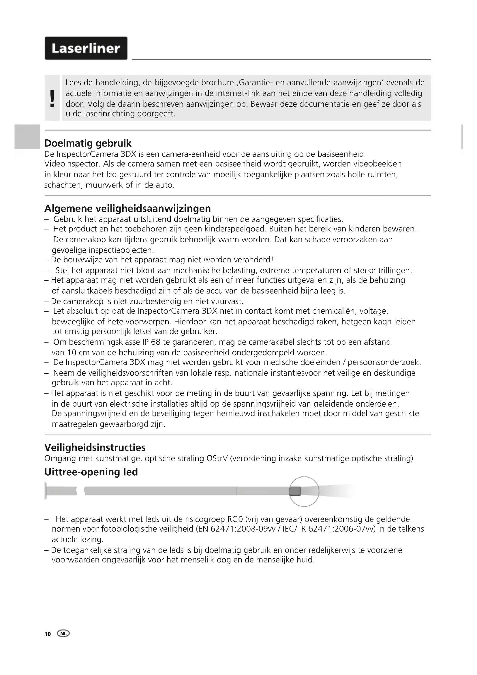 – Het apparaat werkt met leds uit de risicogroep RG0 (vrij van gevaar) overeenkomstig de geldende normen voor fotobiologische veiligheid (EN 62471:2008-09vv / IEC/TR 62471:2006-07vv) in de telkens actuele lezing. – De toegankelijke straling van de leds is bij doelmatig gebruik en onder redelijkerwijs te voorziene voorwaarden ongevaarlijk voor het menselijk oog en de menselijke huid. Uittree-opening led Veiligheidsinstructies Omgang met kunstmatige, optische straling OStrV (verordening inzake kunstmatige optische straling) Algemene veiligheidsaanwijzingen – Gebruik het apparaat uitsluitend doelmatig binnen de aangegeven specicaties. – Het product en het toebehoren zijn geen kinderspeelgoed. Buiten het bereik van kinderen bewaren. – De camerakop kan tijdens gebruik behoorlijk warm worden. Dat kan schade veroorzaken aan gevoelige inspectieobjecten. – De bouwwijze van het apparaat mag niet worden veranderd! – Stel het apparaat niet bloot aan mechanische belasting, extreme temperaturen of sterke trillingen. – Het apparaat mag niet worden gebruikt als een of meer functies uitgevallen zijn, als de behuizing of aansluitkabels beschadigd zijn of als de accu van de basiseenheid bijna leeg is. – De camerakop is niet zuurbestendig en niet vuurvast. – Let absoluut op dat de InspectorCamera 3DX niet in contact komt met chemicaliën, voltage, beweeglijke of hete voorwerpen. Hierdoor kan het apparaat beschadigd raken, hetgeen kaqn leiden tot ernstig persoonlijk letsel van de gebruiker. – Om beschermingsklasse IP 68 te garanderen, mag de camerakabel slechts tot op een afstand van 10 cm van de behuizing van de basiseenheid ondergedompeld worden. – De InspectorCamera 3DX mag niet worden gebruikt voor medische doeleinden / persoonsonderzoek. – Neem de veiligheidsvoorschriften van lokale resp. nationale instantiesvoor het veilige en deskundige gebruik van het apparaat in acht. – Het apparaat is niet geschikt voor de meting in de buurt van gevaarlijke spanning. Let bij metingen in de buurt van elektrische installaties altijd op de spanningsvrijheid van geleidende onderdelen. De spanningsvrijheid en de beveiliging tegen hernieuwd inschakelen moet door middel van geschikte maatregelen gewaarborgd zijn. Doelmatig gebruik De InspectorCamera 3DX is een camera-eenheid voor de aansluiting op de basiseenheid VideoInspector. Als de camera samen met een basiseenheid wordt gebruikt, worden videobeelden in kleur naar het lcd gestuurd ter controle van moeilijk toegankelijke plaatsen zoals holle ruimten, schachten, muurwerk of in de auto. Lees de handleiding, de bijgevoegde brochure ‚Garantie- en aanvullende aanwijzingen‘ evenals de actuele informatie en aanwijzingen in de internet-link aan het einde van deze handleiding volledig door. Volg de daarin beschreven aanwijzingen op. Bewaar deze documentatie en geef ze door als u de laserinrichting doorgeeft. !InspectorCamera 3DX