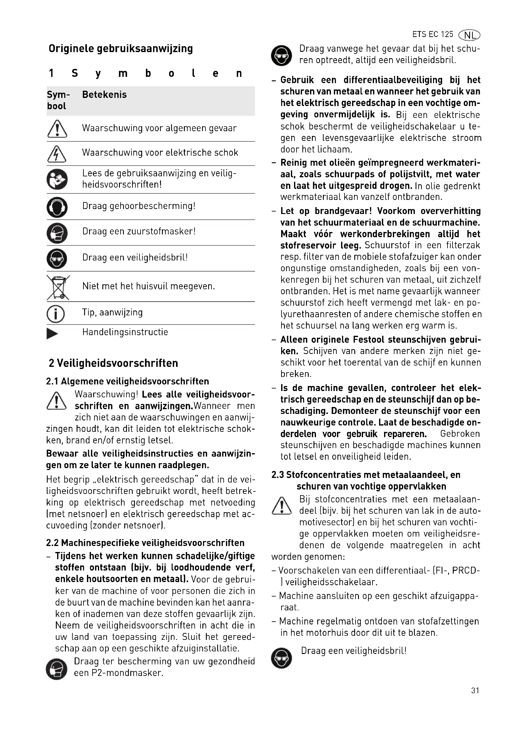schuren van vochtige oppervlakken Bij stofconcentraties met een metaalaan- deel (bijv. bij het schuren van lak in de auto- motivesector) en bij het schuren van vochti- ge oppervlakken moeten om veiligheidsre- denen de volgende maatregelen in acht worden genomen: – Voorschakelen van een differentiaal- (FI-, PRCD- ) veiligheidsschakelaar. – Machine aansluiten op een geschikt afzuigappa- raat. – Machine regelmatig ontdoen van stofafzettingen in het motorhuis door dit uit te blazen. Sym- bool Betekenis Waarschuwing voor algemeen gevaar Waarschuwing voor elektrische schok Lees de gebruiksaanwijzing en veilig- heidsvoorschriften! Draag gehoorbescherming! Draag een zuurstofmasker! Draag een veiligheidsbril! Niet met het huisvuil meegeven. Tip, aanwijzing Handelingsinstructie Draag een veiligheidsbril!32 ETS EC 125