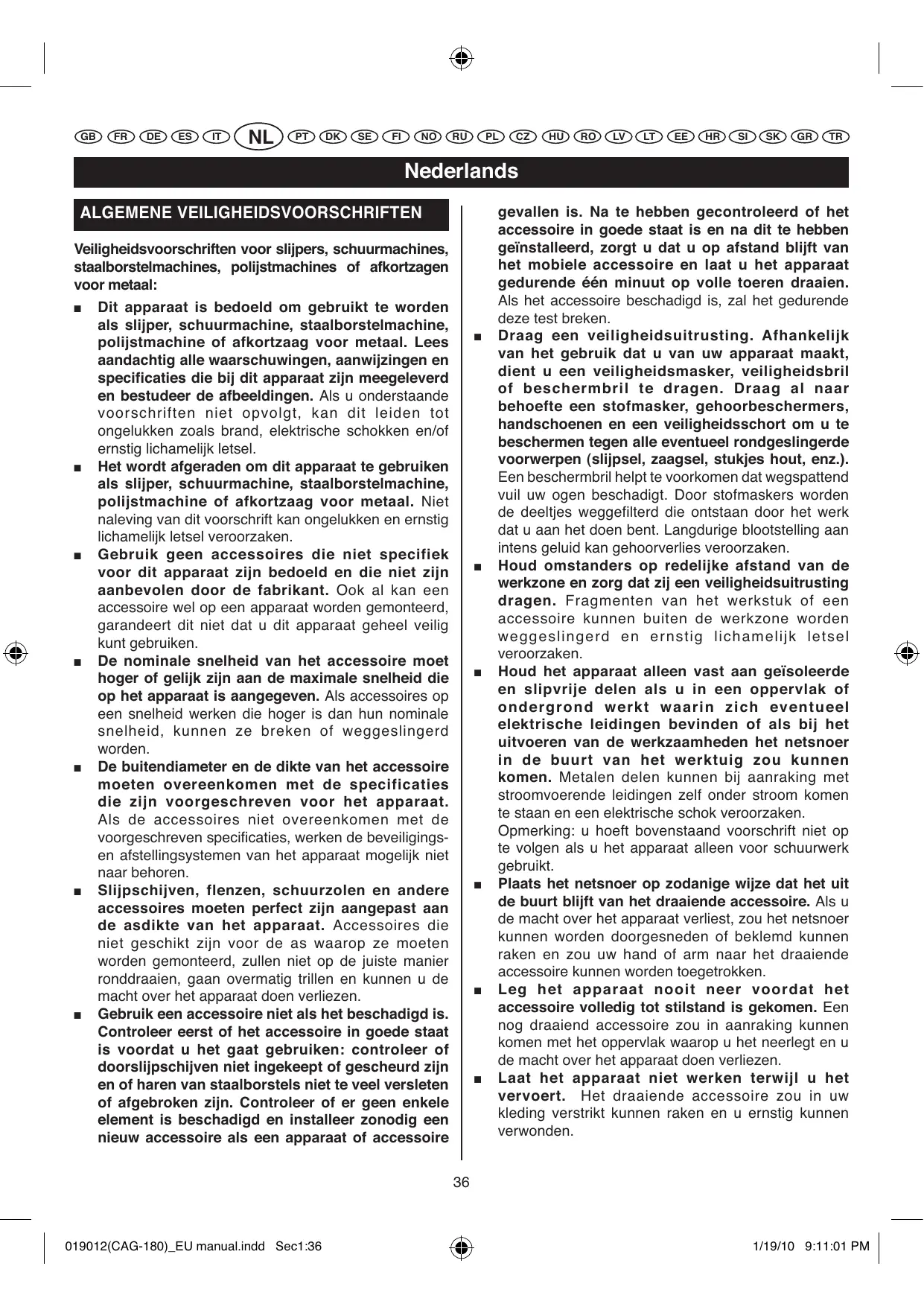 Gebruik de slijper nooit als de beschemkap nicht is geinstalleerd. De slijper mag alleen worden gebruikt als de beschemkap op de juiste wijze is geinstalleerd. Indien u zich Niet aan dit voorschrift houdt, kan dit ernstig lichamelijk letsel veroorzaken,ondat afgebrozen stukken slijpschijf dan in de richting van de gebruiker konnen worden weggeslingerd.