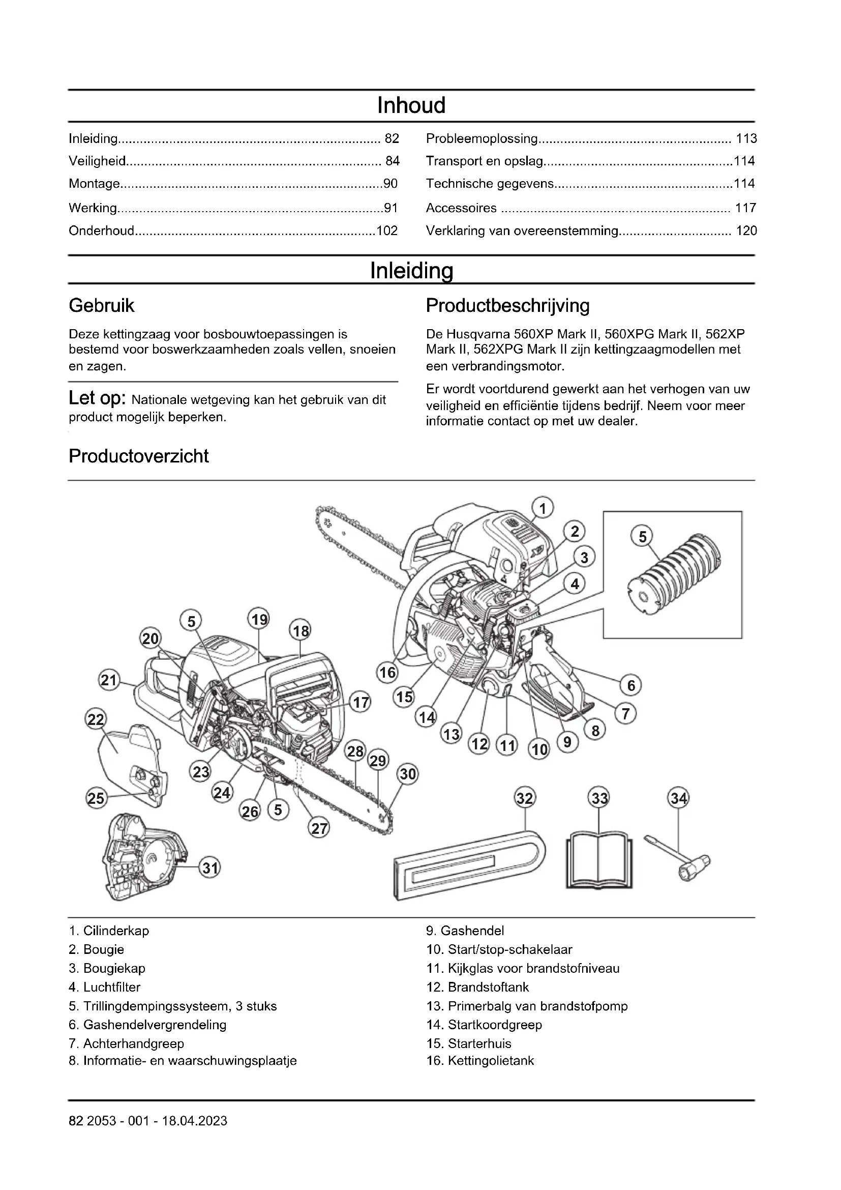 18/45 72 20/50 80 2053 - 001 - 18.04.2023 117Goedgekeurde snijuitrusting voor Husqvarna 562XP Mark II, Husqvarna 562XPG Mark II: Geleider Zaagketting Lengte, inch/cm Kettingsteek, inch Diepte, inch/mm Max. kopradius Type Zaagblad- en kettingcombina- ties 15/38 3/8 0,058/1,5 11T of 34 mm Husqvarna C85 56 16/40 60 18/45 68 20/50 72 24/60 84 28/70 92 15/38 3/8 0,058/1,5 11T of 34 mm Husqvarna S85 56 16/40 60 18/45 68 20/50 72 24/60 84 28/70 92 16/40 3/8 0,050/1,3 11T Husqvarna C83 60 18/45 11T of 34 mm 68 20/50 72 24/60 84 28/70 11T 92 De effectieve zaaglengte is meestal 1 inch minder dan de nominale lengte van de geleider. Vijlbenodigdheden en vijlhoeken Gebruik een Husqvarna-vijlmal om de zaagketting te slijpen. Een Husqvarna-vijlmal zorgt ervoor dat u de tanden in de juiste hoek kunt vijlen. De onderdeelnummers vindt u in onderstaande tabel. Als u niet zeker weet hoe u het type zaagketting op uw product kunt herkennen, raadpleegt u www.husqvarna.com voor meer informatie. C85, C83 5,5 mm / 7/32 inch 586 93 86-01 0,65 mm / 0,025 inch 30° 60° S35G 4,8 mm / 3/16 inch 587 80 91-01 0,65 mm / 0,025 inch 30° 60° 118 2053 - 001 - 18.04.2023S85 5,5 mm / 7/32 inch 586 93 86-01 0,65 mm / 0,025 inch 30° 60° 2053 - 001 - 18.04.2023 119Verklaring van overeenstemming EC-verklaring van overeenstemming Wij, Husqvarna AB, SE-561 82 Huskvarna, Zweden, tel: +46-36-146500, verklaren onder onze alleenverantwoordelijkheid dat het product: Beschrijving Kettingzagen voor bosbouw Merk Husqvarna Type / model 560XP Mark II, 560XPG Mark II, 562XP Mark II, 562XPG Mark II Identificatie Serienummers vanaf 2023 en verder voldoen volledig aan de volgende EU-richtlijnen en -regelgeving: Verordening Beschrijving 2006/42/EG "betreffende machines" 2014/30/EU "betreffende elektromagnetische compatibiliteit" 2000/14/EG "betreffende de geluidsemissies in het milieu" 2011/65/EU "inzake beperking van het gebruik van bepaalde gevaarlijke stoffen in elektrische en elektro- nische apparatuur" en dat de volgende normen en/of technische specificaties zijn toegepast: EN ISO 12100:2010, EN