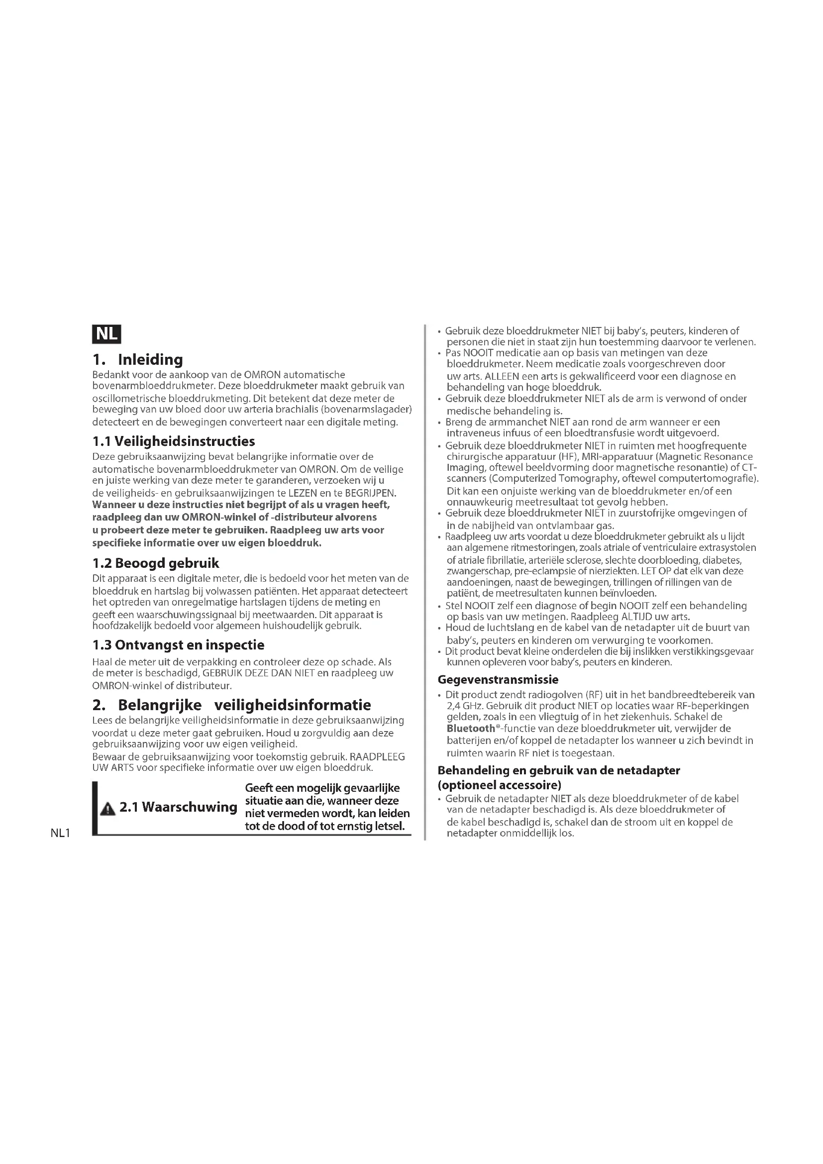 - Gebruik de netadapter NIET als deze bloeddrukmeter of de kabel van de netadapter beschadigd is. Als deze bloeddrukmeter of de kabel beschadigd is, schakel dan de stroom uit en koppel de netadapter onmiddellijk los.NL2
