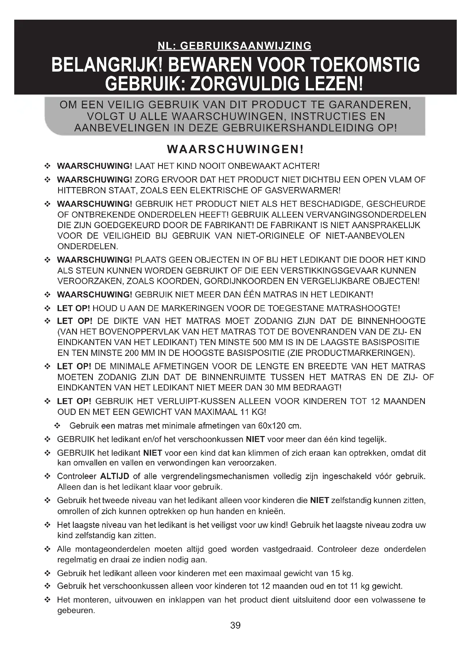 Het laagste niveau van het ledikant is het veiligst voor uw kind! Gebruik het laagste niveau zodra uw kind zichstandig kan zitten.