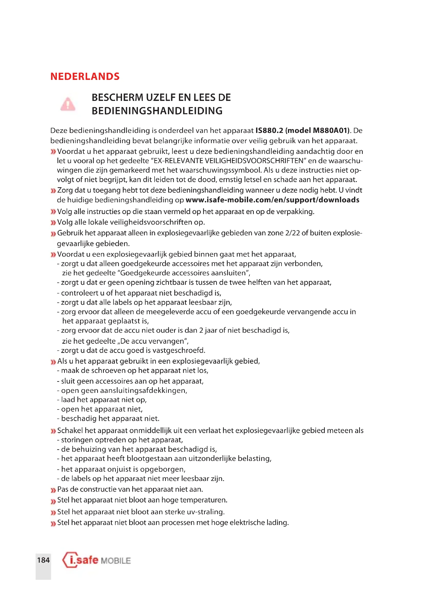BEDIENINGSHANDLEIDING Deze bedieningshandleiding is onderdeel van het apparaat IS880.2 (model M880A01). De bedieningshandleiding bevat belangrijke informatie over veilig gebruik van het apparaat. Voordat u het apparaat gebruikt, leest u deze bedieningshandleiding aandachtig door en let u vooral op het gedeelte “EX-RELEVANTE VEILIGHEIDSVOORSCHRIFTEN” en de waarschu- wingen die zijn gemarkeerd met het waarschuwingssymbool. Als u deze instructies niet op- volgt of niet begrijpt, kan dit leiden tot de dood, ernstig letsel en schade aan het apparaat. Zorg dat u toegang hebt tot deze bedieningshandleiding wanneer u deze nodig hebt. U vindt de huidige bedieningshandleiding op www.isafe-mobile.com/en/support/downloads Volg alle instructies op die staan vermeld op het apparaat en op de verpakking. Volg alle lokale veiligheidsvoorschriften op. Gebruik het apparaat alleen in explosiegevaarlijke gebieden van zone 2/22 of buiten explosie- gevaarlijke gebieden. Voordat u een explosiegevaarlijk gebied binnen gaat met het apparaat, - zorgt u dat alleen goedgekeurde accessoires met het apparaat zijn verbonden, zie het gedeelte “Goedgekeurde accessoires aansluiten”, - zorgt u dat er geen opening zichtbaar is tussen de twee helften van het apparaat, - controleert u of het apparaat niet beschadigd is, - zorgt u dat alle labels op het apparaat leesbaar zijn, - zorg ervoor dat alleen de meegeleverde accu of een goedgekeurde vervangende accu in het apparaat geplaatst is, - zorg ervoor dat de accu niet ouder is dan 2jaar of niet beschadigd is, zie het gedeelte „De accu vervangen“, - zorgt u dat de accu goed is vastgeschroefd. Als u het apparaat gebruikt in een explosiegevaarlijk gebied, - maak de schroeven op het apparaat niet los, - sluit geen accessoires aan op het apparaat, - open geen aansluitingsafdekkingen, - laad het apparaat niet op, - open het apparaat niet, - beschadig het apparaat niet. Schakel het apparaat onmiddellijk uit een verlaat het explosiegevaarlijke gebied meteen als - storingen optreden op het apparaat, - de behuizing van het apparaat beschadigd is, - het apparaat heeft blootgestaan aan uitzonderlijke belasting, - het apparaat onjuist is opgeborgen, - de labels op het apparaat niet meer leesbaar zijn. Pas de constructie van het apparaat niet aan. Stel het apparaat niet bloot aan hoge temperaturen. Stel het apparaat niet bloot aan sterke uv-straling. Stel het apparaat niet bloot aan processen met hoge elektrische lading.NL