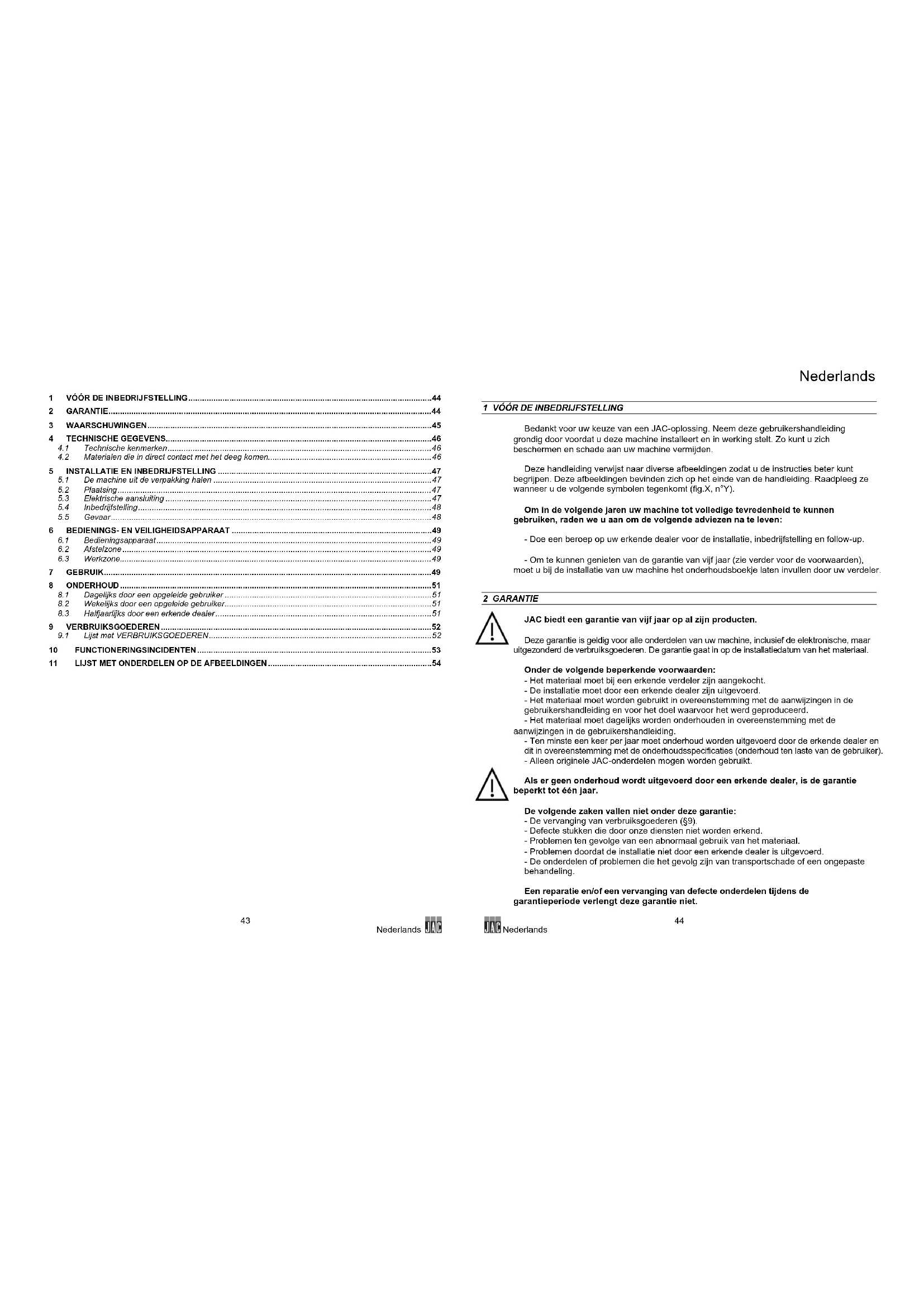 Bedankt voor uw keuze van een JAC-oplossing. Neem deze gebruikershandleiding grondig door voordat u deze machine installeert en in werking stelt. Zo kunt u zich beschermen en schade aan uw machine vermijden. Deze handleiding verwijst naar diverse afbeeldingen zodat u de instructies beter kunt begrijpen. Deze afbeeldingen bevinden zich op het einde van de handleiding. Raadpleeg ze wanneer u de volgende symbolen tegenkomt (fig.X, n°Y). Om in de volgende jaren uw machine tot volledige tevredenheid te kunnen gebruiken, raden we u aan om de volgende adviezen na te leven: - Doe een beroep op uw erkende dealer voor de installatie, inbedrijfstelling en follow-up. - Om te kunnen genieten van de garantie van vijf jaar (zie verder voor de voorwaarden), moet u bij de installatie van uw machine het onderhoudsboekje laten invullen door uw verdeler. 2 GARANTIE JAC biedt een garantie van vijf jaar op al zijn producten. Deze garantie is geldig voor alle onderdelen van uw machine, inclusief de elektronische, maar uitgezonderd de verbruiksgoederen. De garantie gaat in op de installatiedatum van het materiaal. Onder de volgende beperkende voorwaarden: - Het materiaal moet bij een erkende verdeler zijn aangekocht. - De installatie moet door een erkende dealer zijn uitgevoerd. - Het materiaal moet worden gebruikt in overeenstemming met de aanwijzingen in de gebruikershandleiding en voor het doel waarvoor het werd geproduceerd. - Het materiaal moet dagelijks worden onderhouden in overeenstemming met de aanwijzingen in de gebruikershandleiding. - Ten minste een keer per jaar moet onderhoud worden uitgevoerd door de erkende dealer en dit in overeenstemming met de onderhoudsspecificaties (onderhoud ten laste van de gebruiker). - Alleen originele JAC-onderdelen mogen worden gebruikt. Als er geen onderhoud wordt uitgevoerd door een erkende dealer, is de garantie beperkt tot één jaar. De volgende zaken vallen niet onder deze garantie: - De vervanging van verbruiksgoederen (§9). - Defecte stukken die door onze diensten niet worden erkend. - Problemen ten gevolge van een abnormaal gebruik van het materiaal. - Problemen doordat de installatie niet door een erkende dealer is uitgevoerd. - De onderdelen of problemen die het gevolg zijn van transportschade of een ongepaste behandeling. Een reparatie en/of een vervanging van defecte onderdelen tijdens de garantieperiode verlengt deze garantie niet.Nederlands