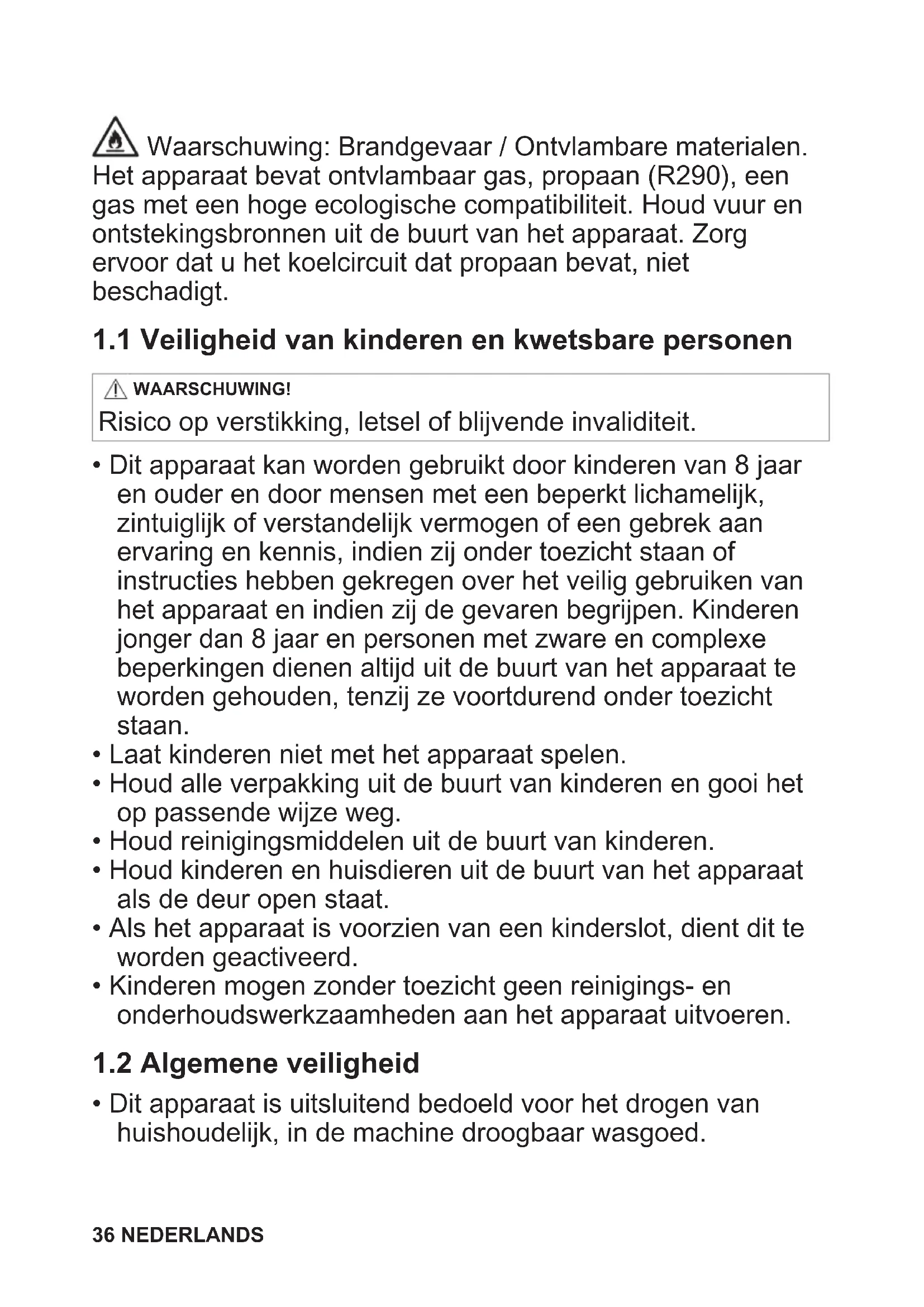 Lees zorgvuldig de meegeleverde instructies voor u het apparaat gaat installeren en gebruiken. De fabrikant is niet verantwoordelijk voor verwondingen of schade die voortvloeien uit de onjuiste installatie of het onjuiste gebruik. Bewaar de instructies altijd op een veilige en toegankelijke locatie voor toekomstig gebruik en download de volledige versie die online beschikbaar is. NEDERLANDS 35Waarschuwing: Brandgevaar / Ontvlambare materialen. Het apparaat bevat ontvlambaar gas, propaan (R290), een gas met een hoge ecologische compatibiliteit. Houd vuur en ontstekingsbronnen uit de buurt van het apparaat. Zorg ervoor dat u het koelcircuit dat propaan bevat, niet beschadigt.