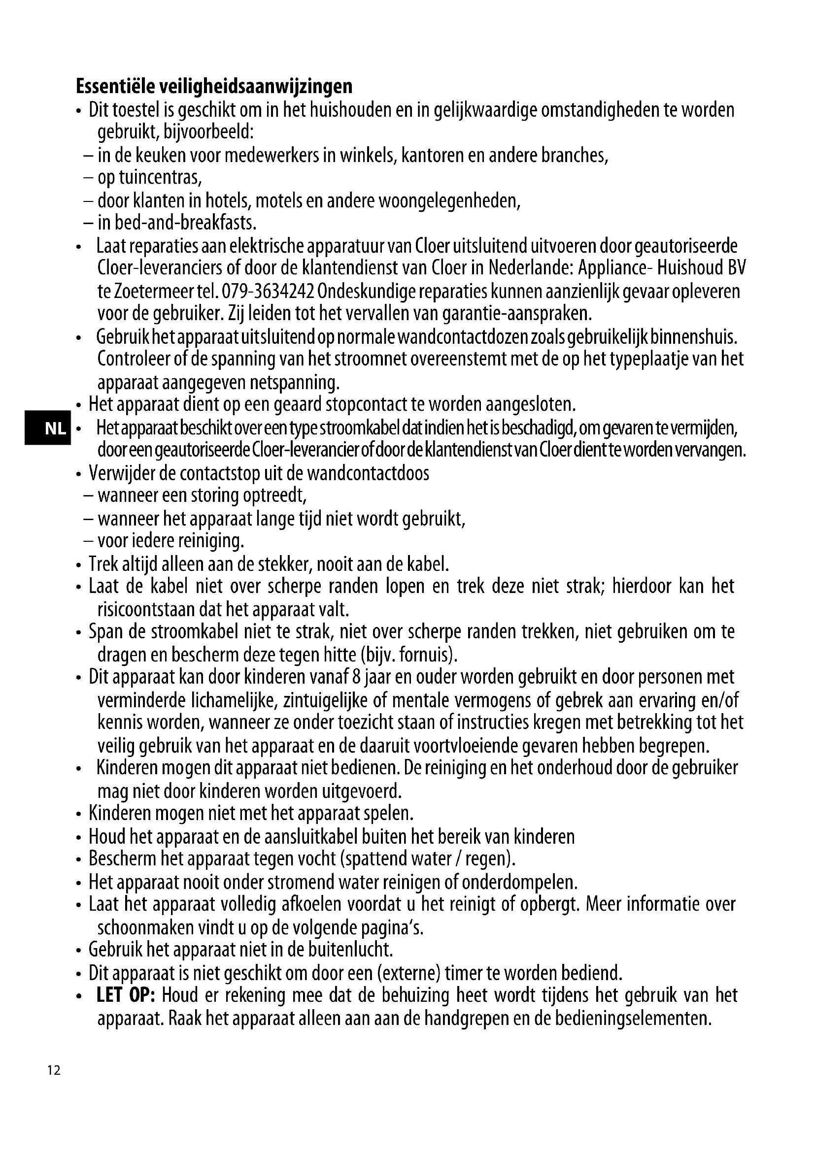 - Laat reparaties aan elektrische apparatuur van Cloer uitsluitend uitvoeren door geautoriseerde Cloer-leveranciers of door de klantendienst van Cloer in Nederlande: Appliance- Huishoud BV te Zoetermeer tel. 079-3634242 Ondeskundige reparaties kunnen aanzienlijk gevaar opleveren voor de gebruiker. Zij leiden tot het vervallen van garantie-aanspraken.